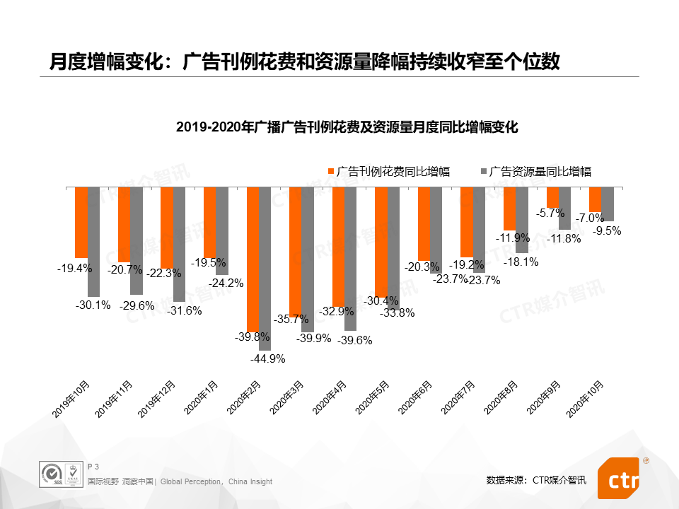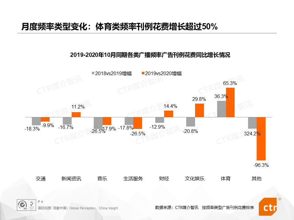 根据CTR媒介智讯的数据显示,2020年10月广播广告刊例花费和资源量同比降幅分别为7.0%和9.5%。各频率类型中,体育类频率花费增长最为明显,达65.3%,其次,新闻资讯、财经和文化娱乐类频率的刊例花费也有不同程度的上涨。
