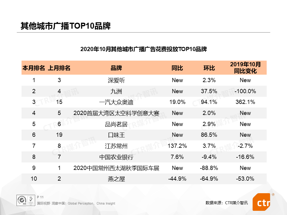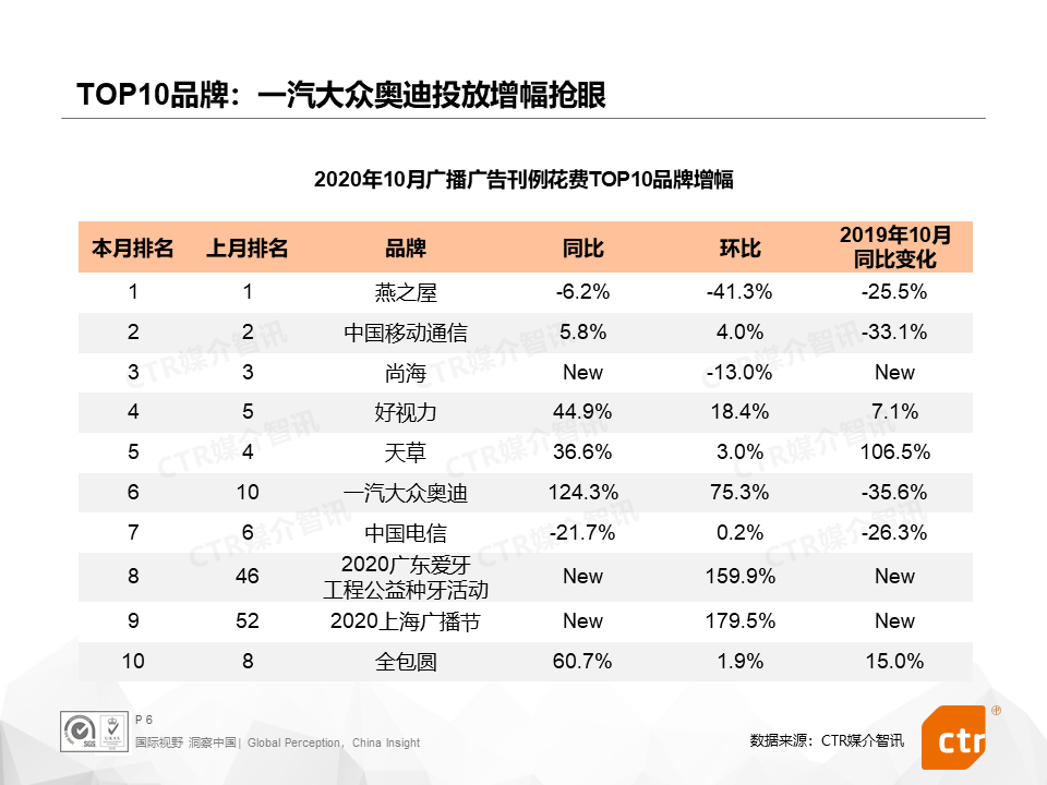 广播刊例花费TOP10品牌榜单中,一汽大众奥迪同比增长翻倍,达124.3%,主推一汽大众奥迪A6轿车、一汽大众奥迪Q7 SUV这两款产品,广告主要投放在中央人民广播电台、中国国际广播电台和江浙地区的广播电台音乐和交通频率。与上月相比,榜中八成品牌广告投放环比呈现正增长,其中一汽大众奥迪环比增长也很明显,达75.3%。