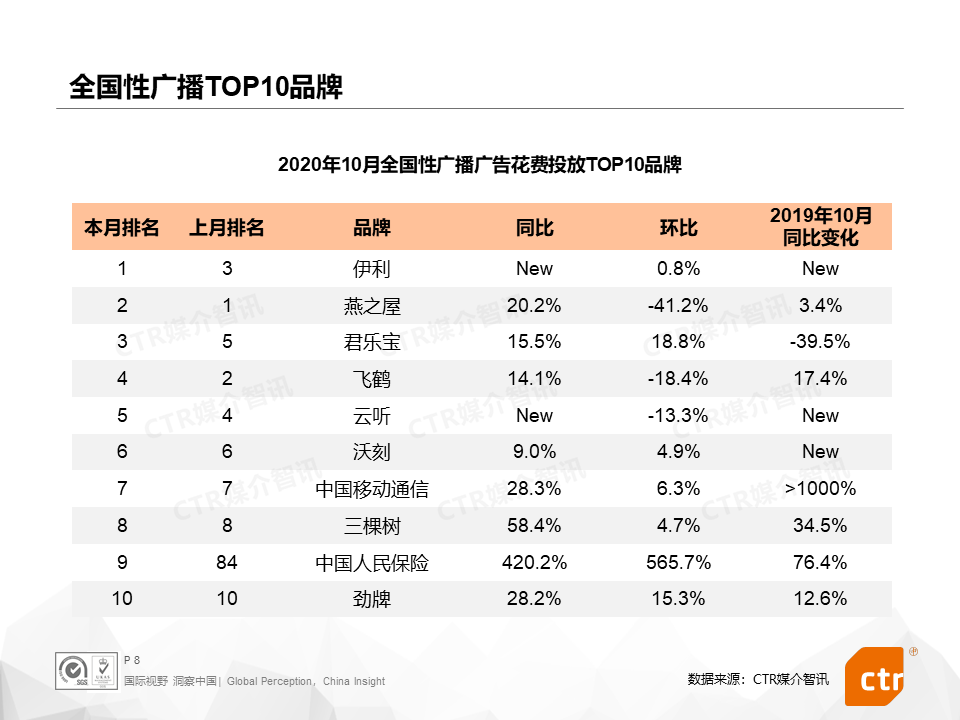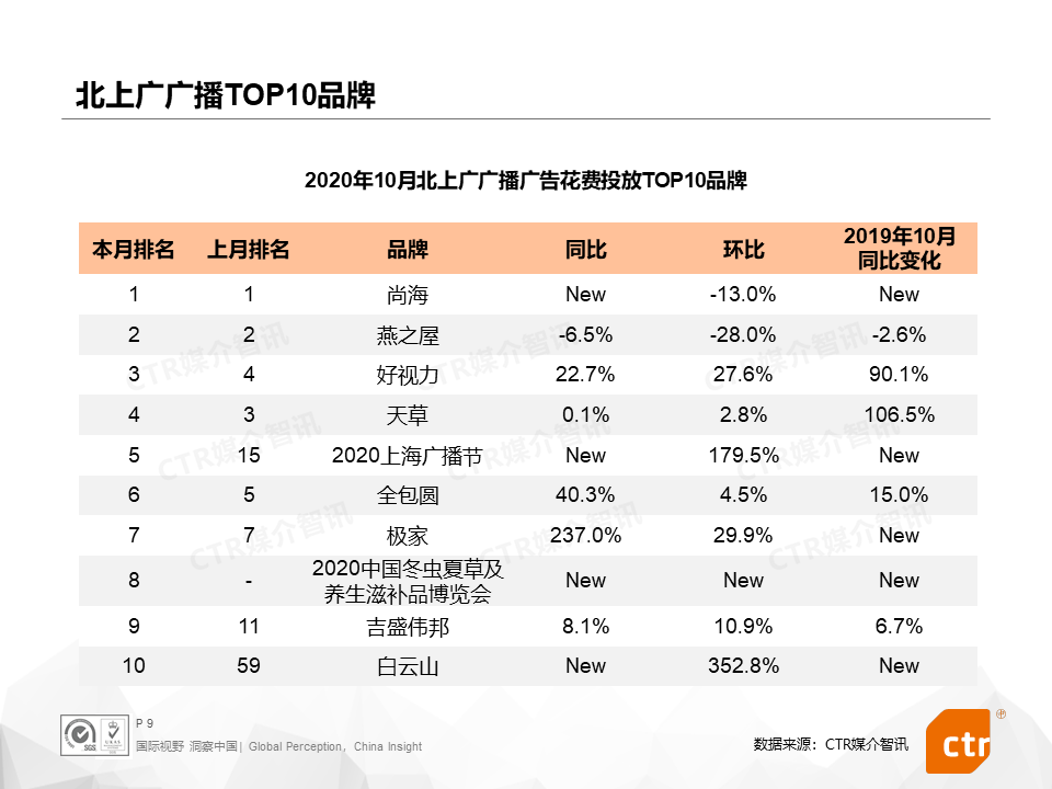 与上年同期比较,TOP10榜单中除食品和药品广播广告刊例花费分别上涨6.4%和25.7%以外,其他行业均呈现负增长;与上月比较,榜单内八成行业呈现负增长,只有药品和金融业这两个行业分别环比增长54.7%和4.3%。