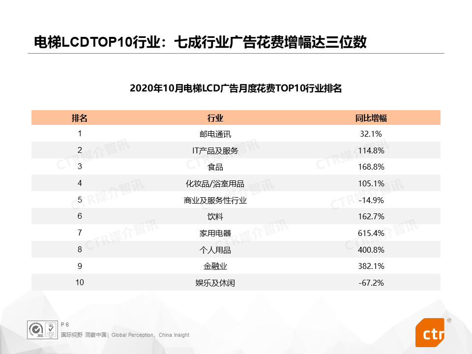 10月,IT产品及服务行业广告花费增长最明显,在传统户外、电梯LCD和影院视频广告花费榜单均位列前三甲,增幅分别为399.6%、114.8%和326.9%。主要由贝壳找房、原始传奇网络游戏和作业帮APP的增投拉动。此外,在电梯广告中,原始传奇网络游戏首次投放就贡献了IT产品及服务行业22.0%的花费。