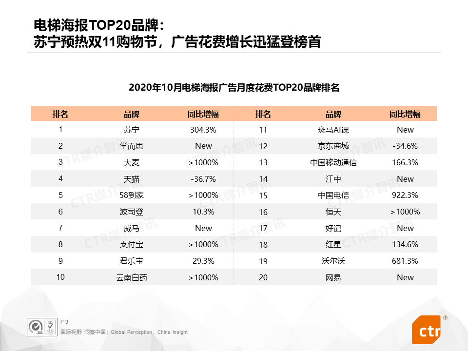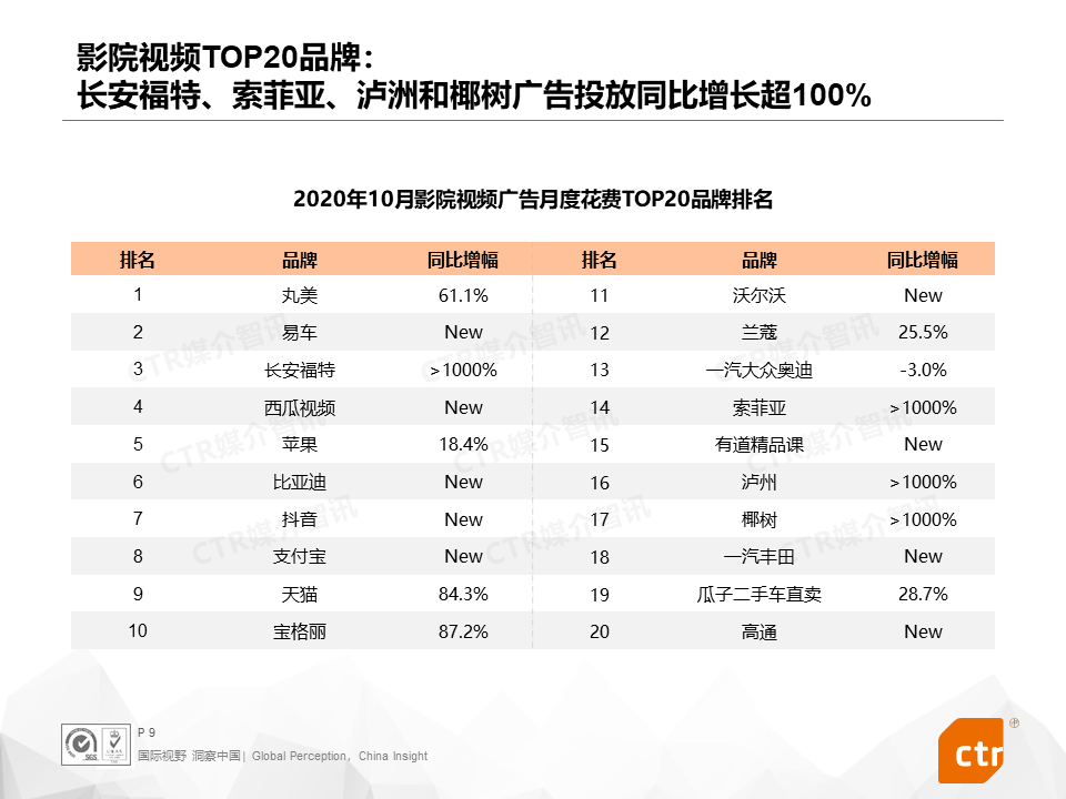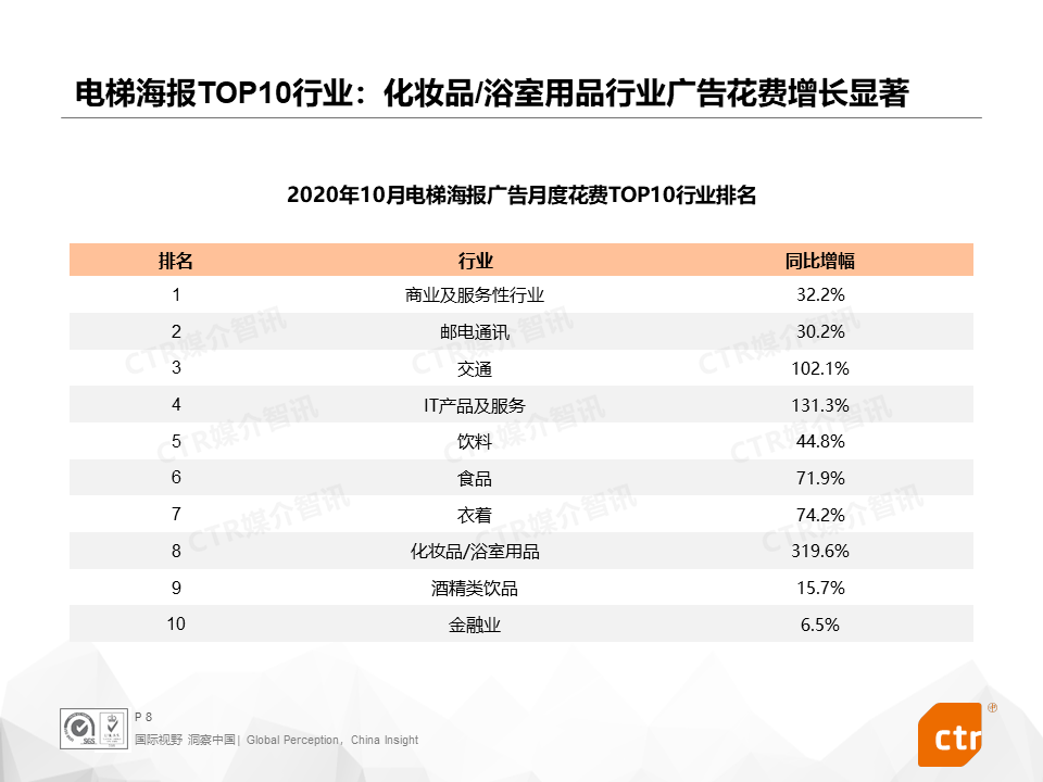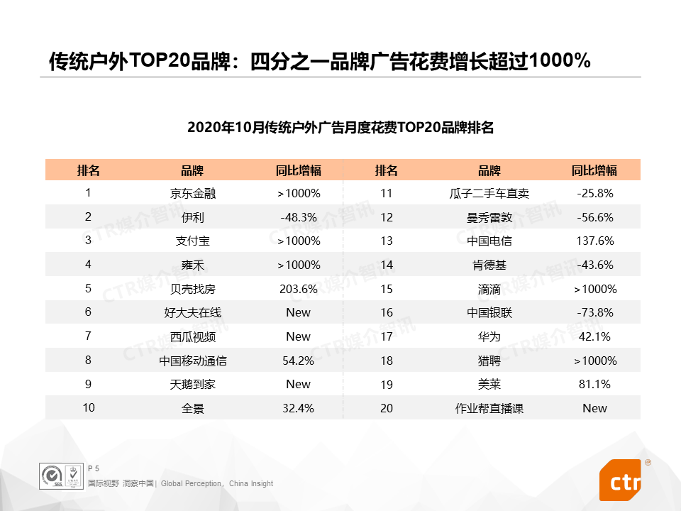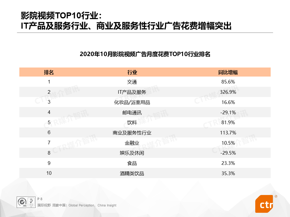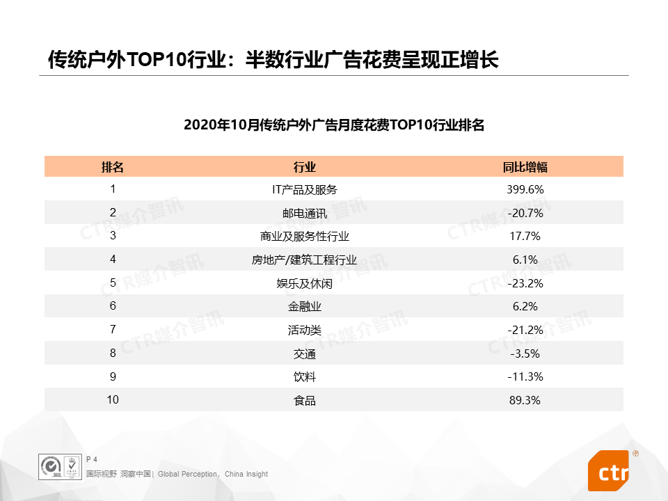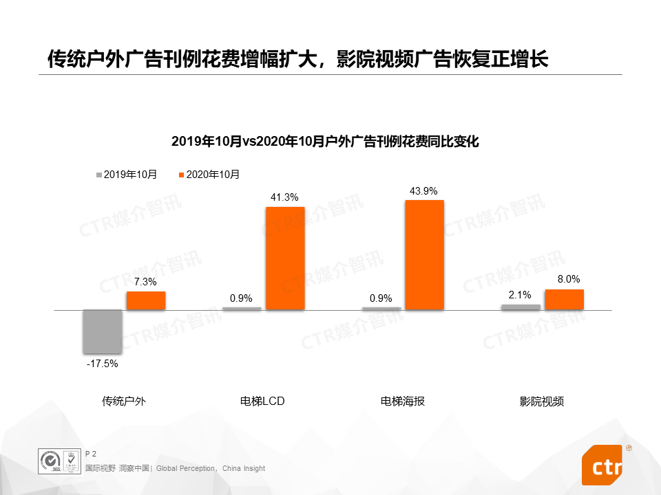 根据CTR媒介智讯的数据显示,2020年10月传统户外广告花费同比增长7.3%,增幅较上个月进一步扩大;电梯LCD和电梯海报广告花费增幅均超过40%;随着各地影院逐步开放和排片量的增长,10月份影院视频广告花费同比增长恢复正增长,增幅为8.0%。