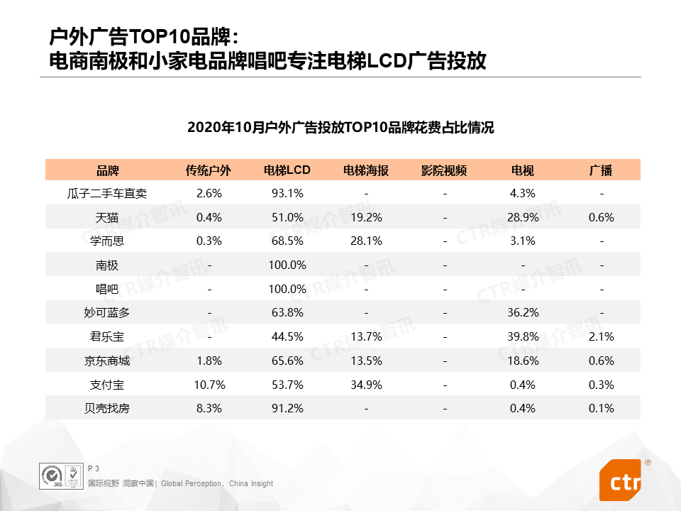 瓜子二手车直卖、南极、支付宝和贝壳找房四大品牌本年度首次进入户外广告TOP10品牌榜单,在电梯广告渠道上花费占比均超过80%。