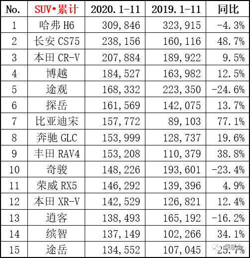 - 11月份SUV销量96.4万辆,同比增长9.3%,环比增长2.8%;累计销量786.8万辆,同比下降3.7%。