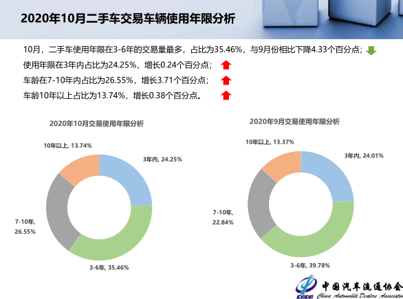 10月,二手车使用年限在3-6年的交易量最多,占比为35.46%,与9月份相比下降4.33个百分点;使用年限在3年内占比为24.25%,增长0.24个百分点;车龄在7-10年内占比为26.55%,增长3.71个百分点;车龄10年以上占比为13.74%,增长0.38个百分点。