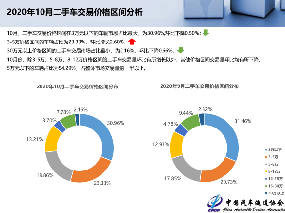 10月,二手车交易价格区间在3万元以下的车辆市场占比最大,为30.96%,环比下降0.50%;3-5万价格区间的车辆占比为23.33%,环比增长2.60%;30万元以上价格区间的二手车交易市场占比最小,为2.16%,环比下降0.66%;10月份,除3-5万、5-8万、8-12万价格区间的二手车交易量环比有所增长以外,其他价格区间交易量环比均有所下降。5万元以下的车辆占比为54.29%,占整体市场交易量的一半以上。