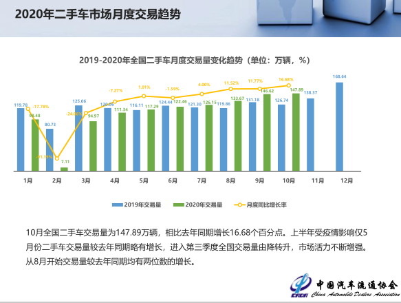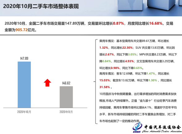 2020年10月,全国二手车市场交易量147.89万辆,交易量环比增长0.87%,月度同比增长16.68%。交易金额为905.72亿元。