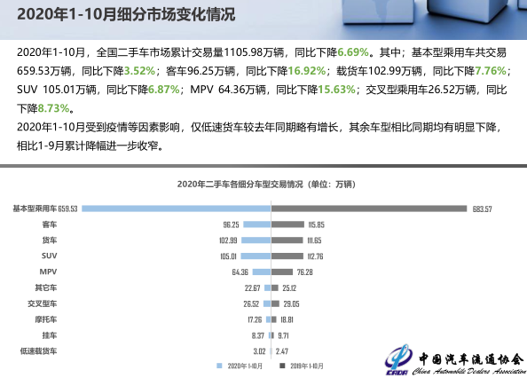 2020年1-10月,全国二手车市场累计交易量1105.98万辆,同比下降6.69%。其中;基本型乘用车共交易659.53万辆,同比下降3.52%;客车96.25万辆,同比下降16.92%;载货车102.99万辆,同比下降7.76%;SUV 105.01万辆,同比下降6.87%;MPV 64.36万辆,同比下降15.63%;交叉型乘用车26.52万辆,同比下降8.73%。