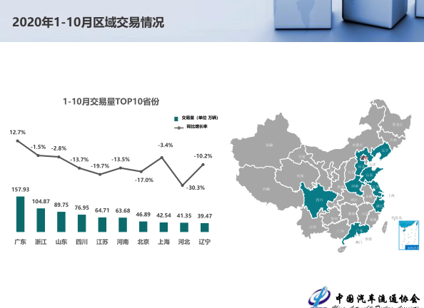10月全国二手车交易量为147.89万辆,相比去年同期增长16.68个百分点。上半年受疫情影响仅5月份二手车交易量较去年同期略有增长,进入第三季度全国交易量由降转升,市场活力不断增强。从8月开始交易量较去年同期均有两位数的增长。