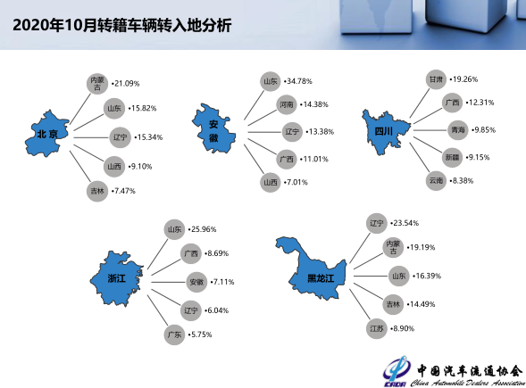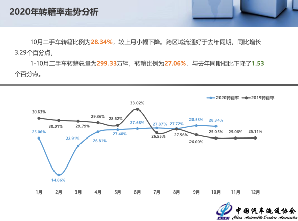 1-10月二手车转籍总量为299.33万辆,转籍比例为27.06%,与去年同期相比下降了1.53个百分点。