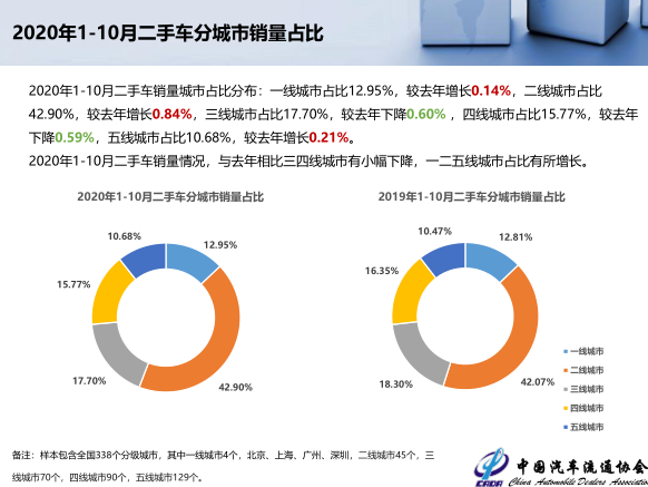 2020年1-10月二手车销量情况,与去年相比三四线城市有小幅下降,一二五线城市占比有所增长。