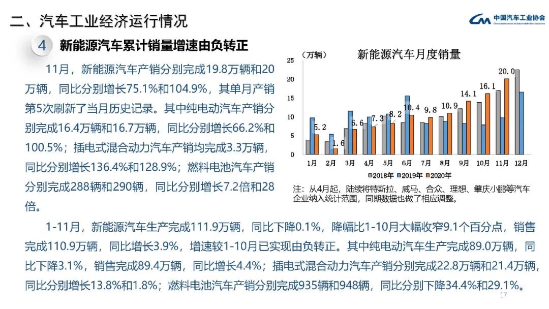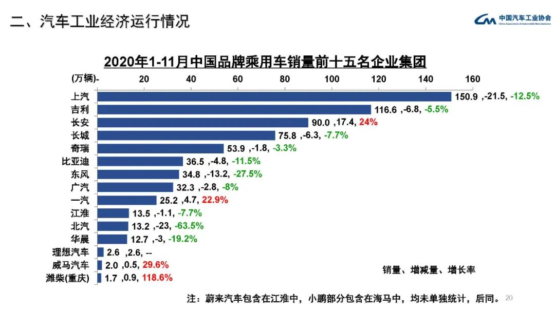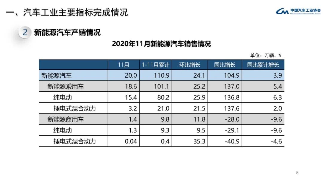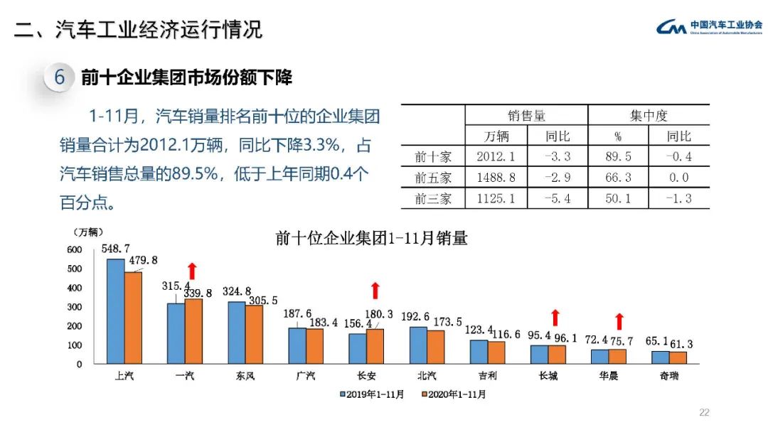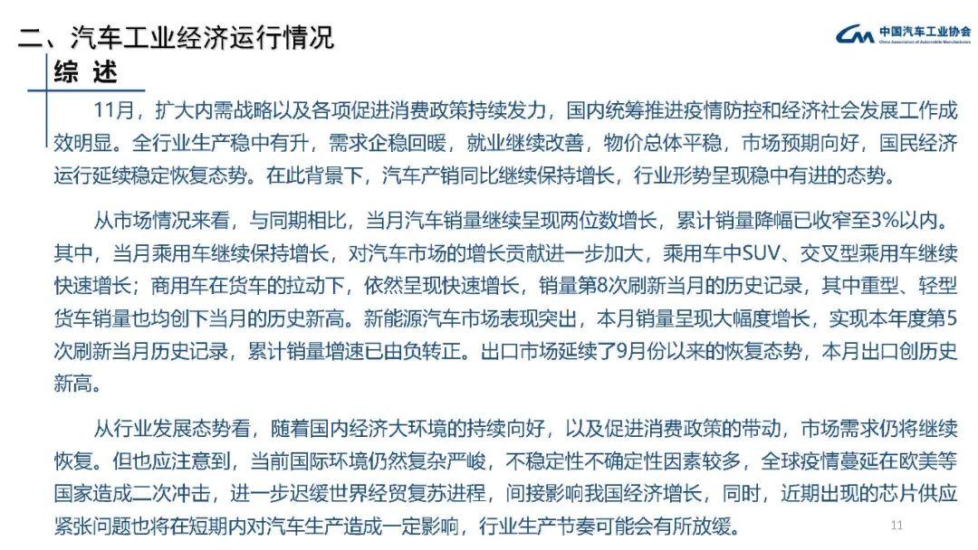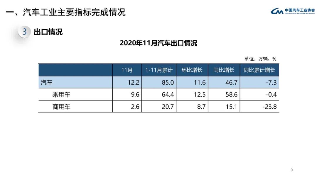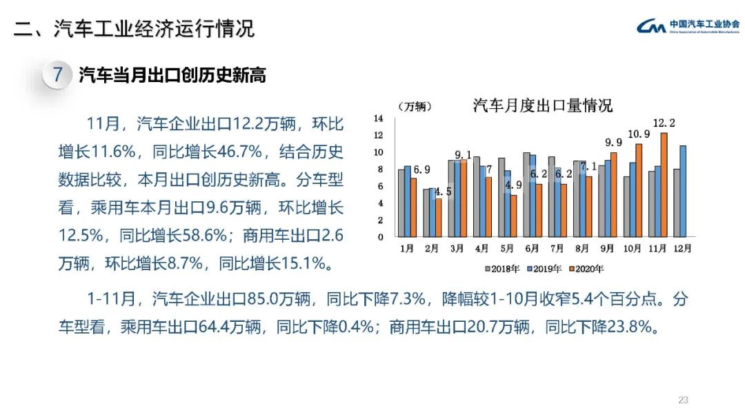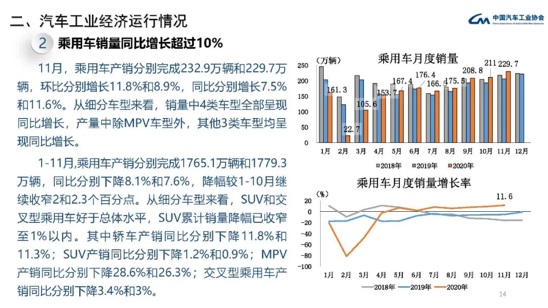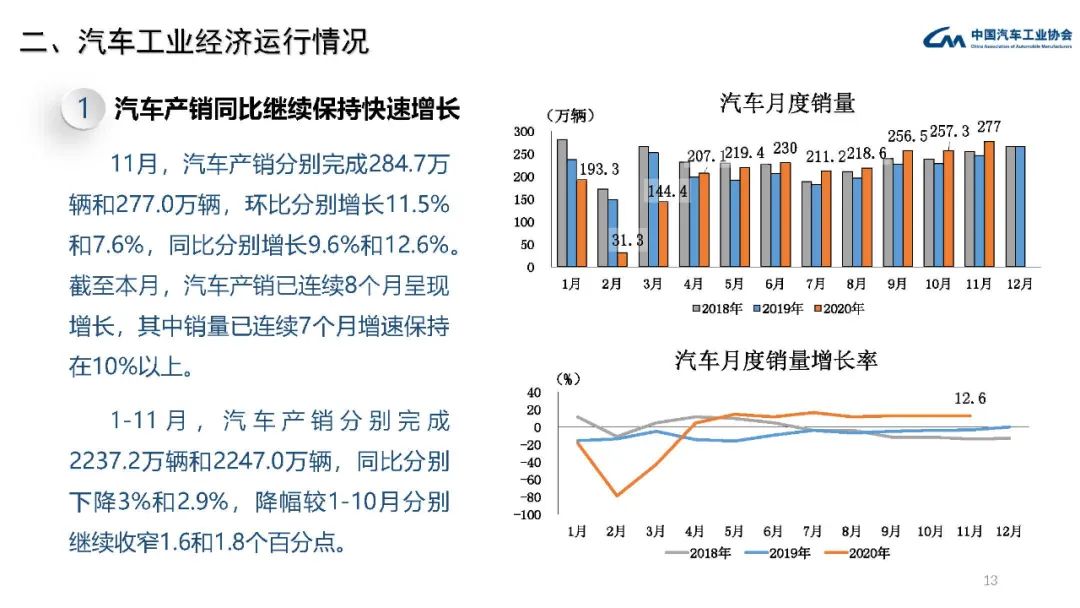 中国汽车工业协会:2020年11月汽车工业经济运行情况 据中国汽车工业协会统计分析,2020年11月,汽车产销延续了增长势头,产销量均创年内新高。1-11月,汽车产销降幅收窄至3%以下。 更多阅读:中国汽车工业协会:2022年11月汽车工业经济运行情况中汽协:2021年7月汽车工业经济运行情况中汽协:2021年6月汽车工业经济运行情况工信部:2023年5月汽车工业经济运行情况中国汽车工业协会:2022年4月汽车工业经济运行情况中国汽车工业协会:2022年3月汽车工业经济运行情况中国汽车工业协会:2021年10月汽车工业经济运行情况中汽协:2018年5月汽车工业经济运行情况工信部:2016年11月汽车工业经济运行情况中国汽车工业协会:2024年10月汽车工业产销情况中国汽车工业协会:2022年汽车工业产销情况中国汽车工业协会:2022年11月汽车工业产销情况中国汽车工业协会:2022年10月中国汽车工业经济运行情况中国汽车工业协会:2021年9月中国汽车工业经济运行情况中国汽车工业协会:2021年2月中国汽车工业经济运行情况