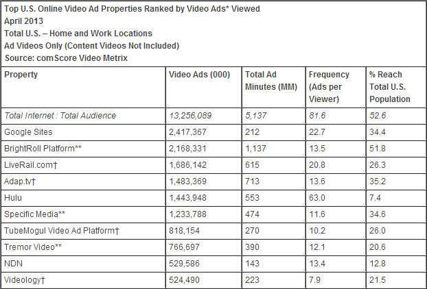 4月美国网络视频广告观看量达到创纪录的133亿次,谷歌旗下网站以24亿次位居首位。BrightRoll平台以22亿次位居其次,之后是LiveRail.com(17亿次)、Adap.tv(15亿次)和Hulu(14亿次)。美国人4月份观看网络视频广告的总时长为51亿分钟,BrightRoll平台位居第一,达到11亿分钟。当月网络视频广告共计覆盖了53%的美国人口,平均每人观看82次广告。Hulu人均观看次数最高,达到63次。