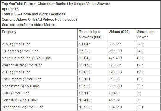 从YouTube的合作机构来看,该网站最受欢迎的频道是音乐视频频道VEVO,4月的独立用户访问量达到5170万,Fullscreen位居其次,达到3740万。之后是Maker Stutios(3380万)、华纳唱片(3220万)、ZEFR(2810万)。在YouTube的十大合作伙伴中,Machinima的互动性最强,用户人均观看64分钟视频,其次是Maker Studios(人均50分钟)。如果按照视频播放量来看,VEVO仍然位居首位,达到5.86亿次,Maker Studios以4.71亿次位居第二。