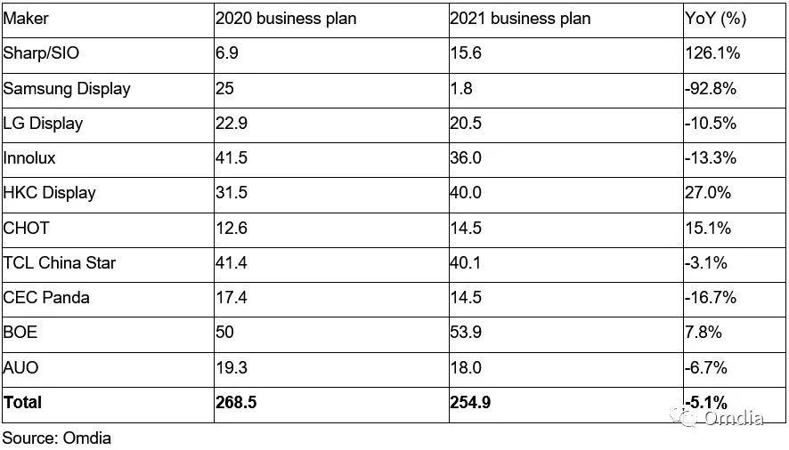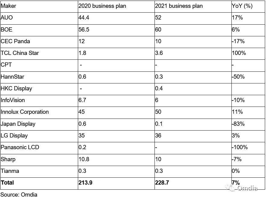 由于IT面板需求强劲且元器件短缺,预计2021年液晶电视面板出货量将同比下降5%