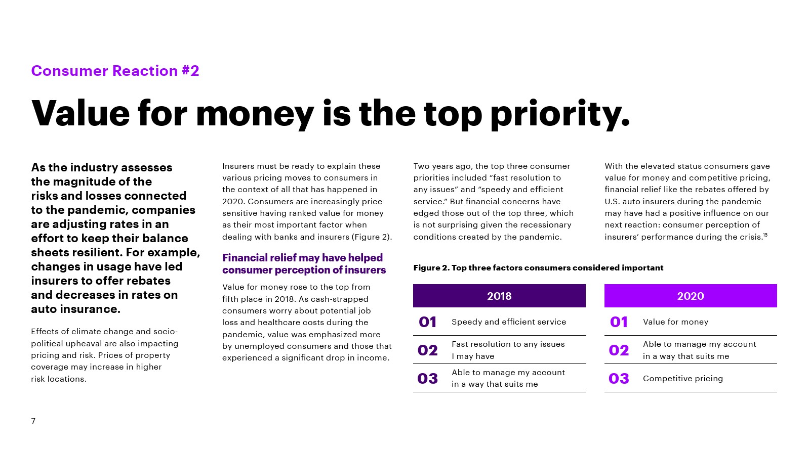 大流行和由此产生的财务影响已经改变了消费者在决定是否留在保险公司时的优先事项。两年前,消费者将首要任务放在了客户服务上,包括快速有效地解决问题。但是,消费者现在将“物有所值”作为留在保险公司的主要原因。