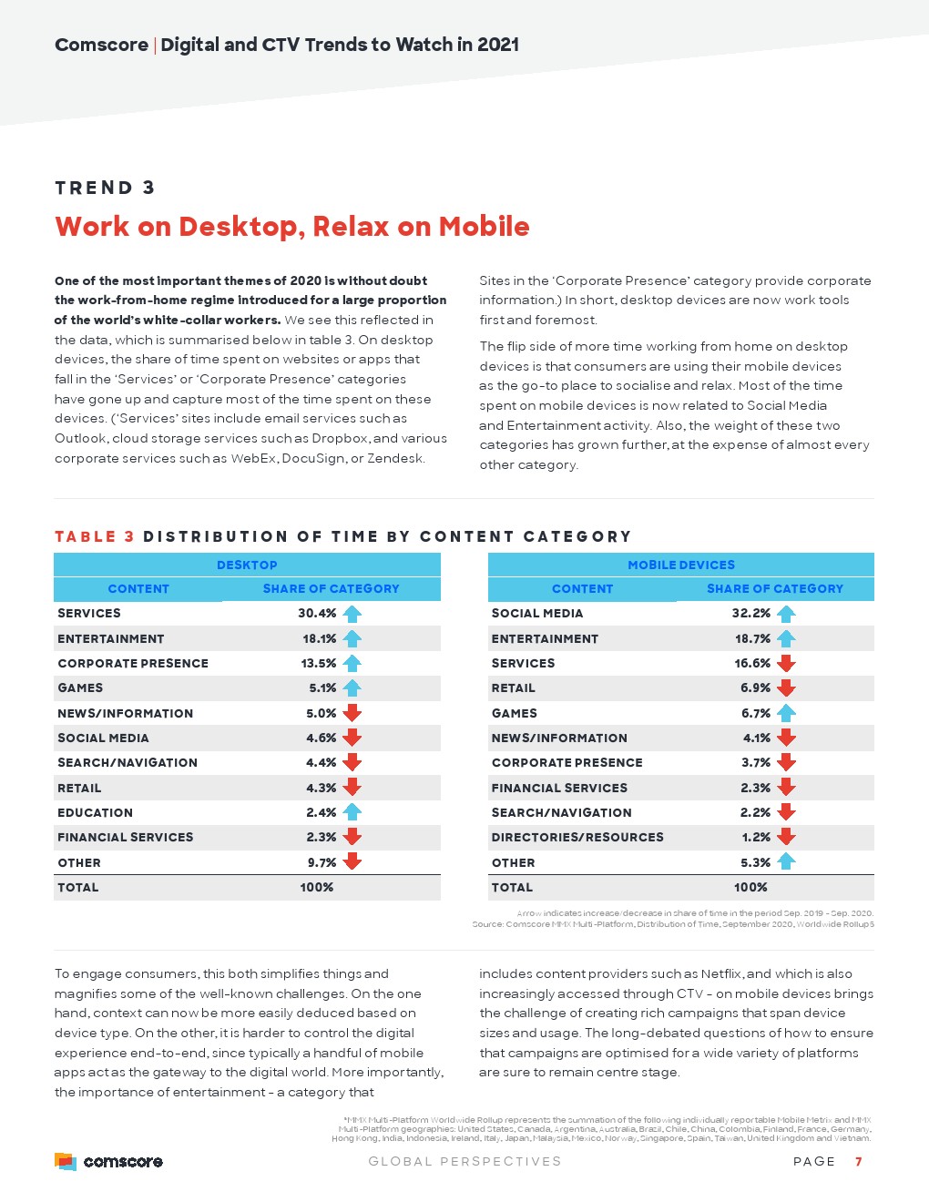 不同技术平台的使用日益专业化。数据揭示了如何在给定平台上用最少的广告捕获受众的大部分时间。简而言之,台式机用于工作,而移动设备用于放松。可以根据设备类型更轻松地推断出上下文,因此可以根据受众群体概况和平台确定的上下文来调整广告系列。