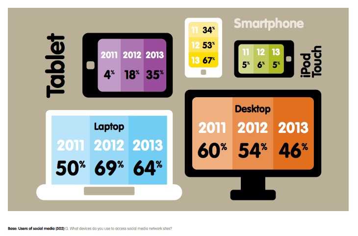 根据2013年社会化媒体报告,在过去12个月中,通过智能手机访问社交网络的比例从53%增长至67%,使其成为年龄在50岁以下的各个群体最常使用的社交网络访问工具。