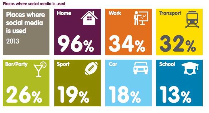 过去一年在工作场所,交通工具,酒吧/宴会上使用社交媒体的比例也有明显的上升。实时上有6%的甚至在厕所的时候使用社交网络,而18%的人在车内使用社交网络,凸显出生活中社交网络的使用几乎无处不在