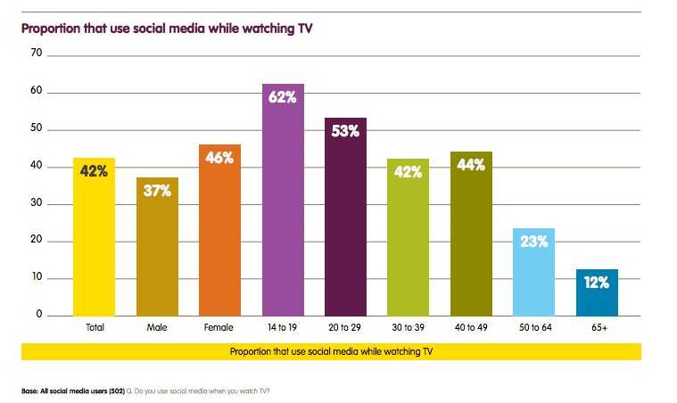 年龄在14-29岁的用户在看电视时喜欢使用社交网络,而年龄在65岁以上的用户则比较不感冒。