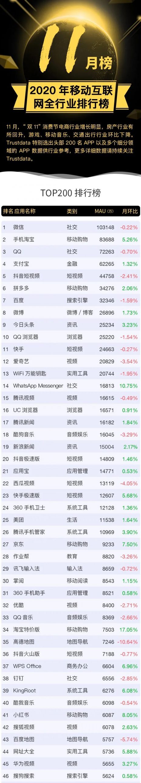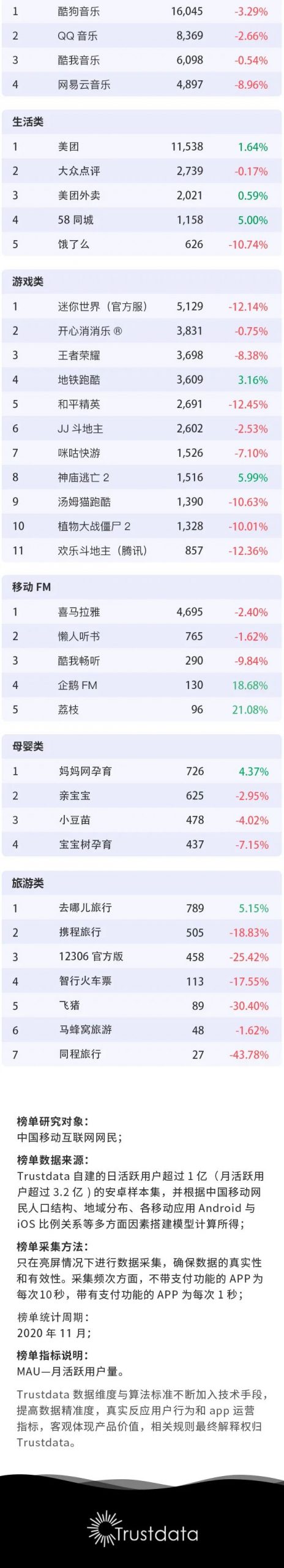 Trustdata:2020年11月移动互联网全行业排行榜 更多阅读:Trustdata:2020年7月移动互联网全行业排行榜Trustdata:2022年10月移动互联网全行业排行榜Trustdata:2019年7月移动互联网全行业排行榜Trustdata:2020年12月移动互联网全行业排行榜Trustdata:2020年6月移动互联网全行业排行榜Trustdata:2021年4月移动互联网全行业排行榜Trustdata:2020年3月移动互联网全行业排行榜Trustdata:2021年5月移动互联网全行业排行榜Trustdata:2020年2月移动互联网全行业排行榜Trustdata:2021年6月移动互联网全行业排行榜Trustdata:2020年1月移动互联网全行业排行榜Trustdata:2019年12月移动互联网全行业排行榜Trustdata:2019年11月移动互联网全行业排行榜Trustdata:2019年10月移动互联网全行业排行榜Trustdata:2020年10月移动互联网全行业排行榜