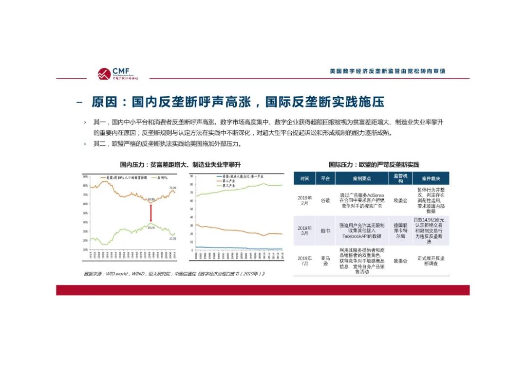 报告显示,美国初期的反垄断态度主要为包容宽松,保护创新和消费者福利,其原因是美国力求保持数字经济国际领头地位,结果是实现了数字经济大发展,但促进竞争与保护消费者成果未达预期,而随着国内反垄断呼声高涨,国际反垄断实践施压,美国当前反垄断态度则明显从宽松转向审慎。