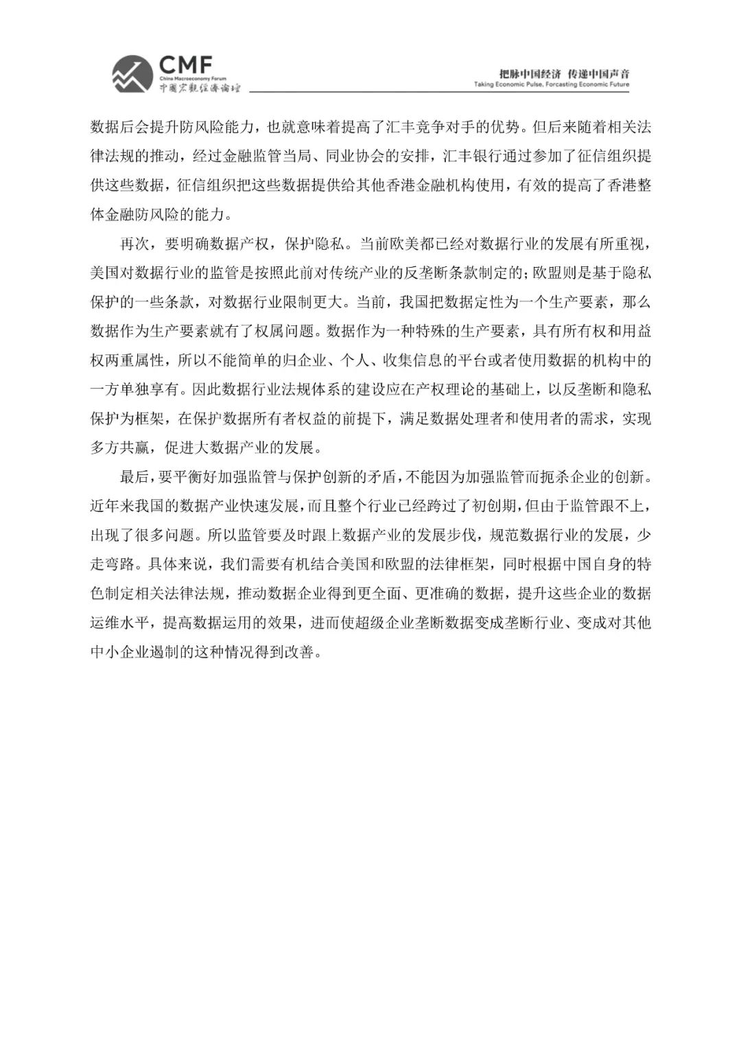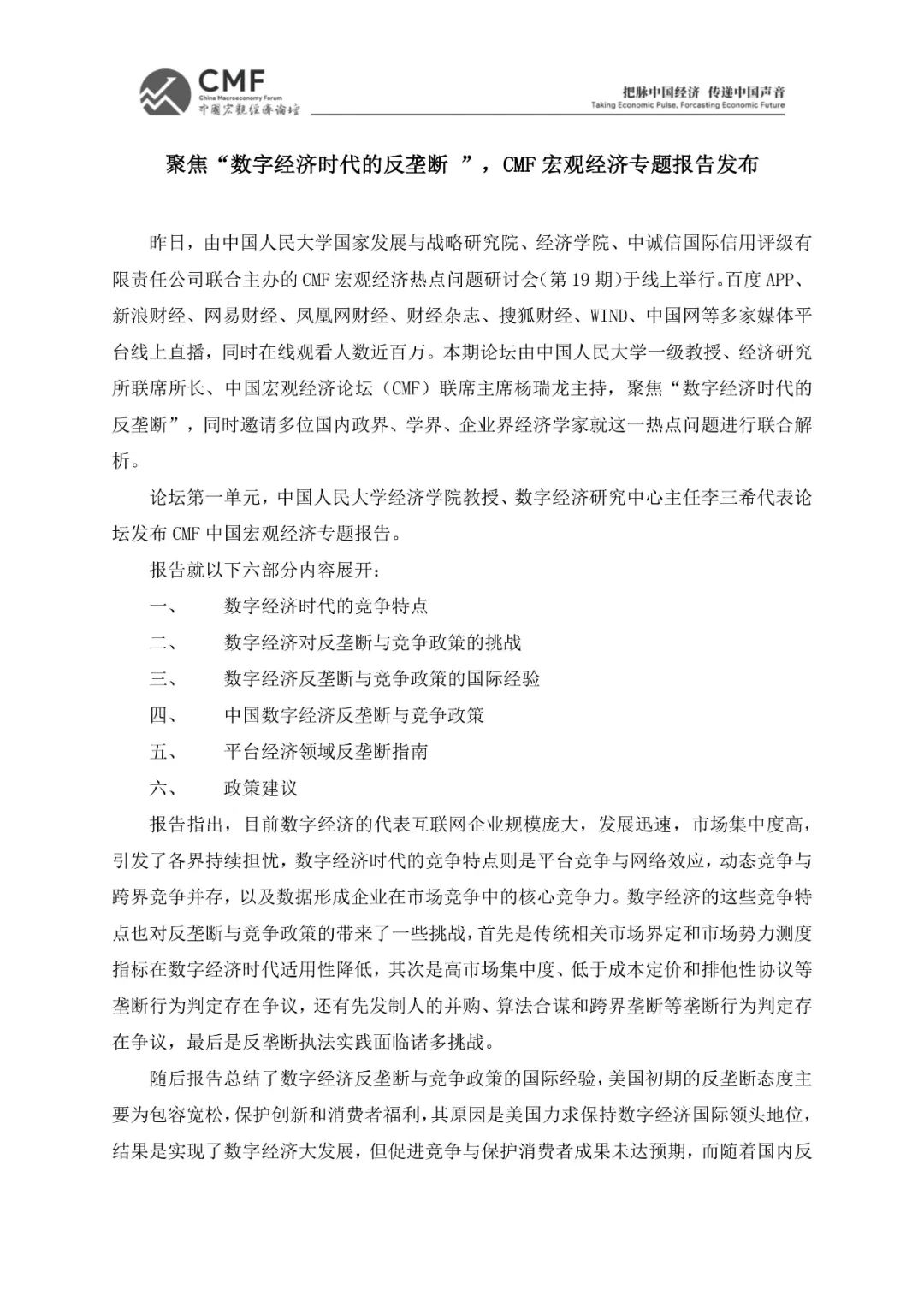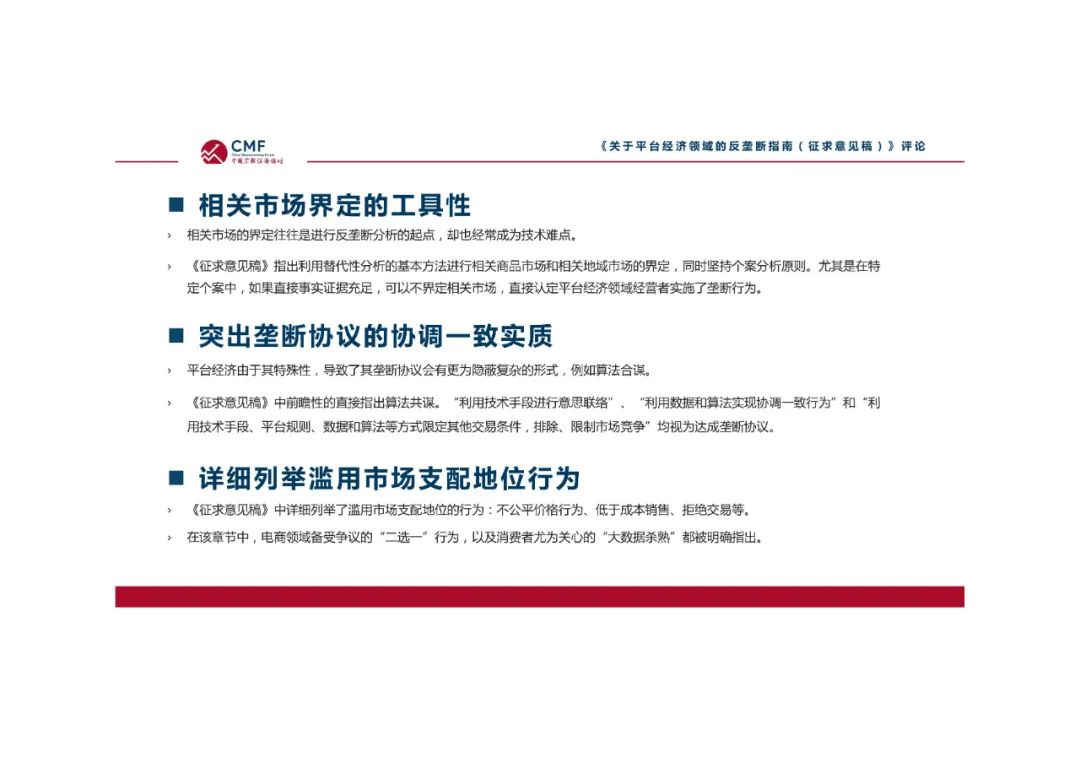 此外,报告还评价了近期出台的《关于平台经济领域的反垄断指南(征求意见稿)》,认为它的定位是全国第一个针对平台经济经营者的反垄断指南,是我国反垄断进程中一个重大突破。在反垄断实施中具有指引和协助分析的作用,它的目的是要预防和制止平台经济的垄断行为,引导平台经济领域经营者依法合规经营,促进线上经济持续健康的发展。另外该指南有着诸多积极方面,如具有相关市场界定的工具性,突出垄断协议的协调一致实质,详细列举滥用市场支配地位行为,关于经营者集中的两点新突破,再次重申杜绝因滥用行政权力而排除、限制竞争,但目前仍有部分内容有待完善和商榷。