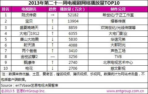 据艺恩enTVbase电视决策智库统计,第二十周网络TOP10电视剧累计播放量10.3亿,环比增长2%.《陆贞传奇》继续大幅领跑,成为5月电视剧网络播放的最大赢家;《宝贝》播放量迅速攀升实力亦不容小觑。本周无抢眼新剧登场;《金枝欲孽2》播出接近尾声之时首次入榜,排位第八。