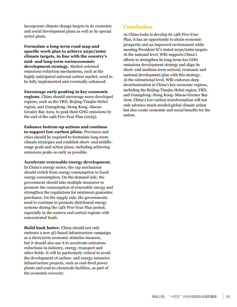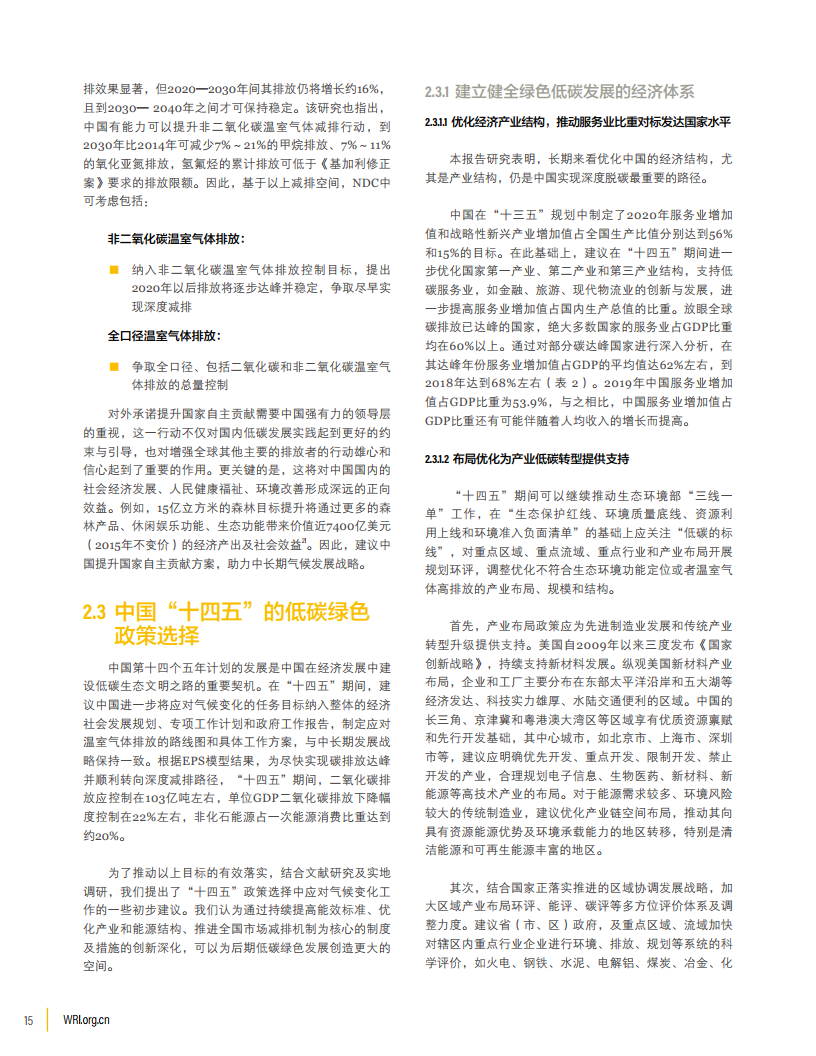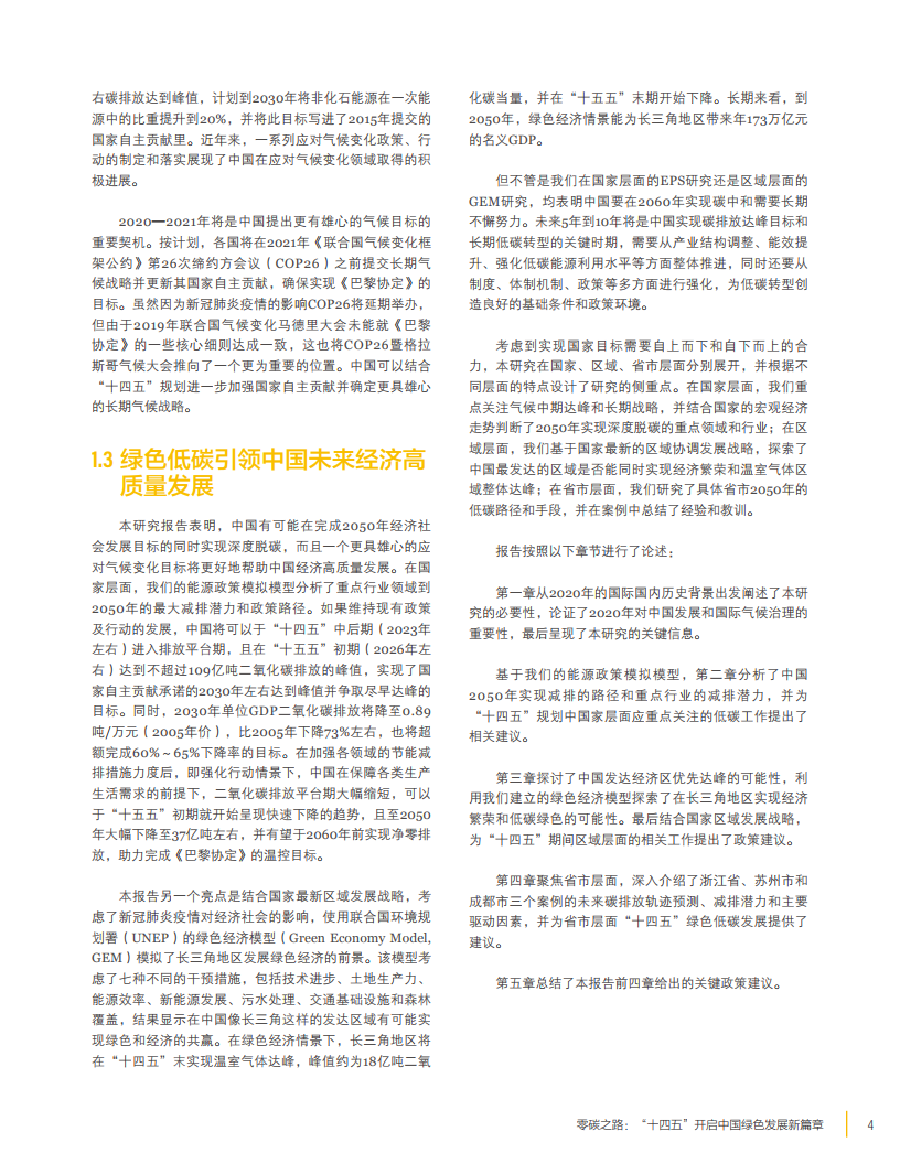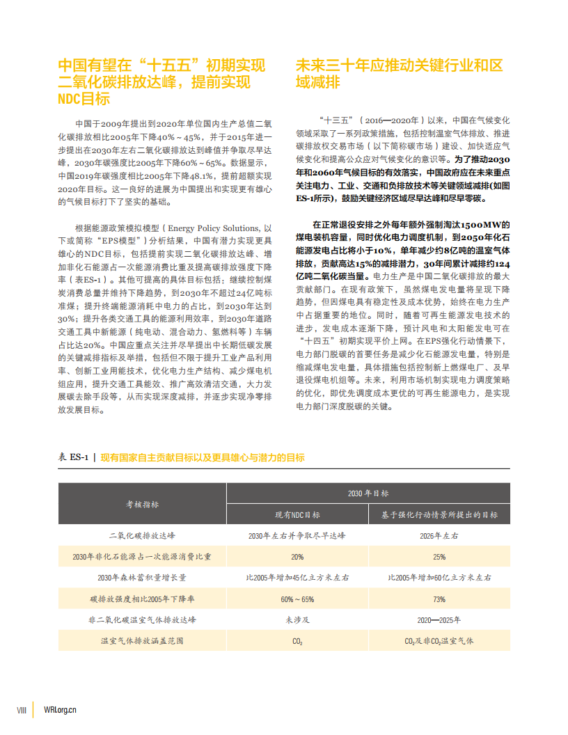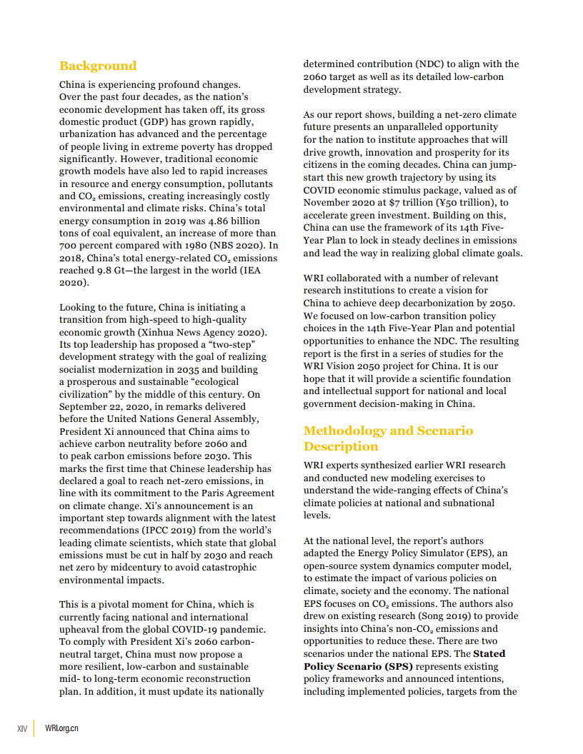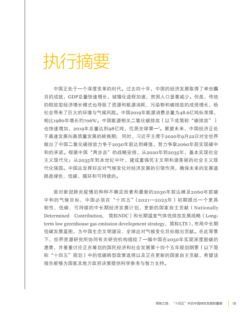 面对新冠肺炎疫情后种种不确定因素和最新的2030年前达峰及2060年前碳 中和的气候目标,中国必须在“十四五”(2021—2025年)初期提出一个更具 韧性、低碳、可持续的中长期经济发展计划,更新的国家自主贡献(Nationally Determined Contribution, 简称NDC)和长期温室气体低排放发展战略(Longterm low greenhouse gas emission development strategy,简称LTS),布局中长期 低碳发展蓝图,为中国生态文明建设、全球应对气候变化目标做出贡献。在此背景 下,世界资源研究所协同有关研究机构描绘了一幅中国在2050年实现深度脱碳的 愿景,并着重讨论正在筹划的国民经济和社会发展第十四个五年规划纲要(以下简 称“十四五”规划)中的低碳转型政策选择以及正在更新的国家自主贡献,希望该 报告能够为国家及地方政府决策提供科学参考与智力支持。