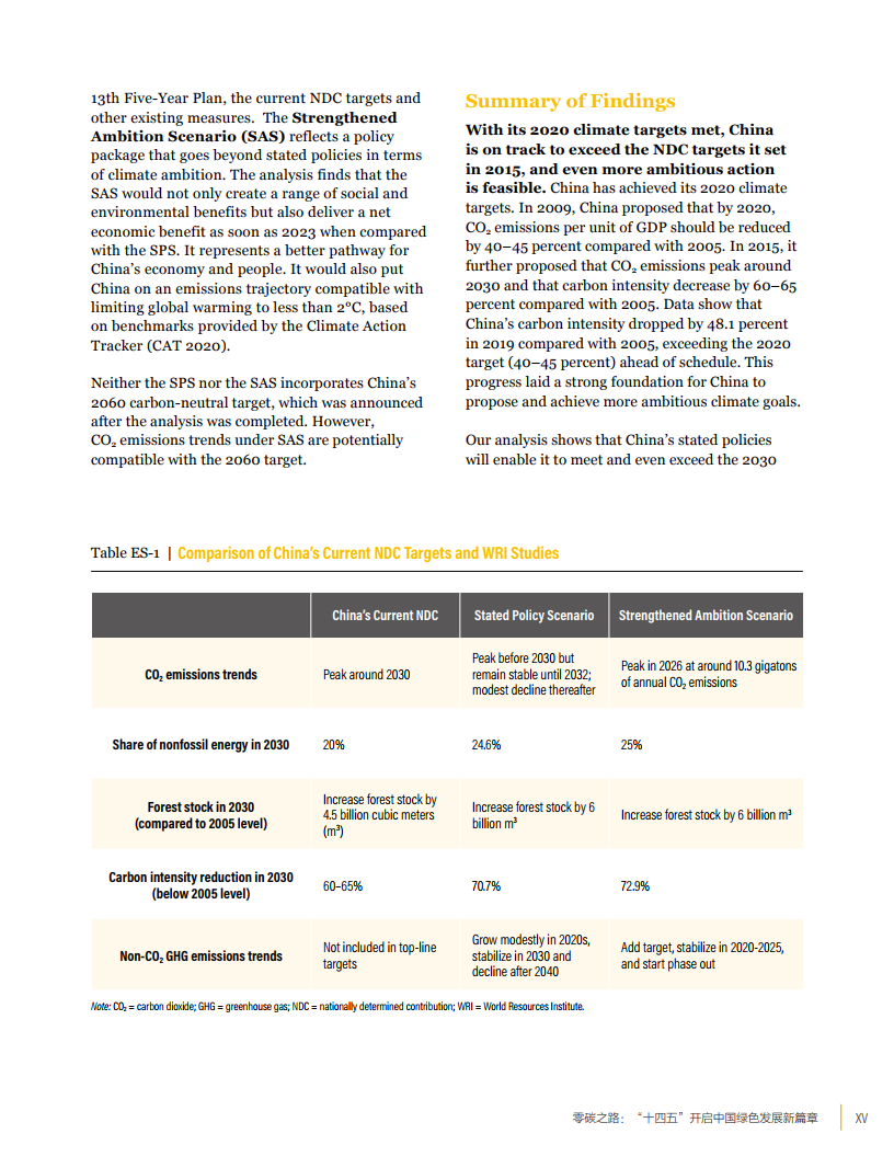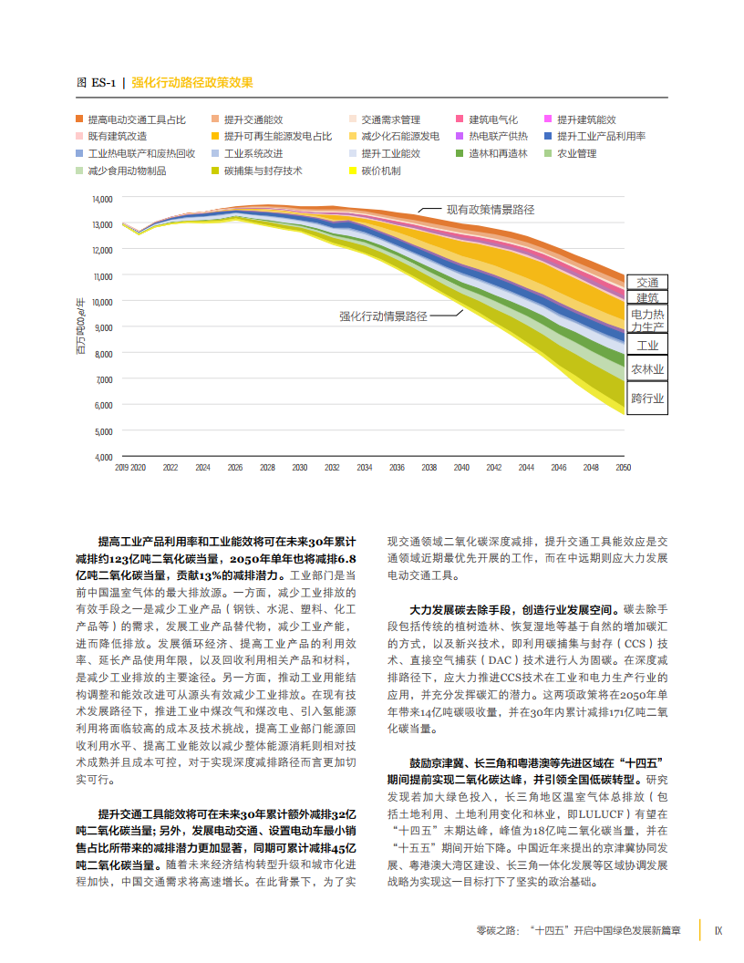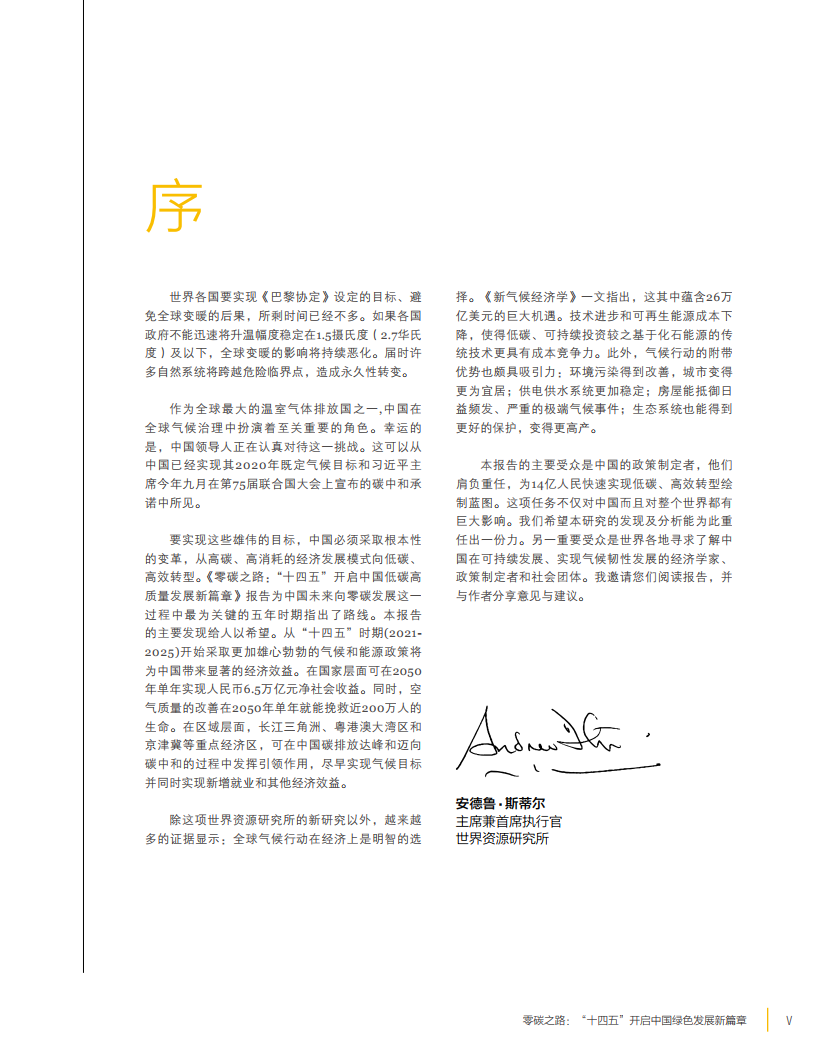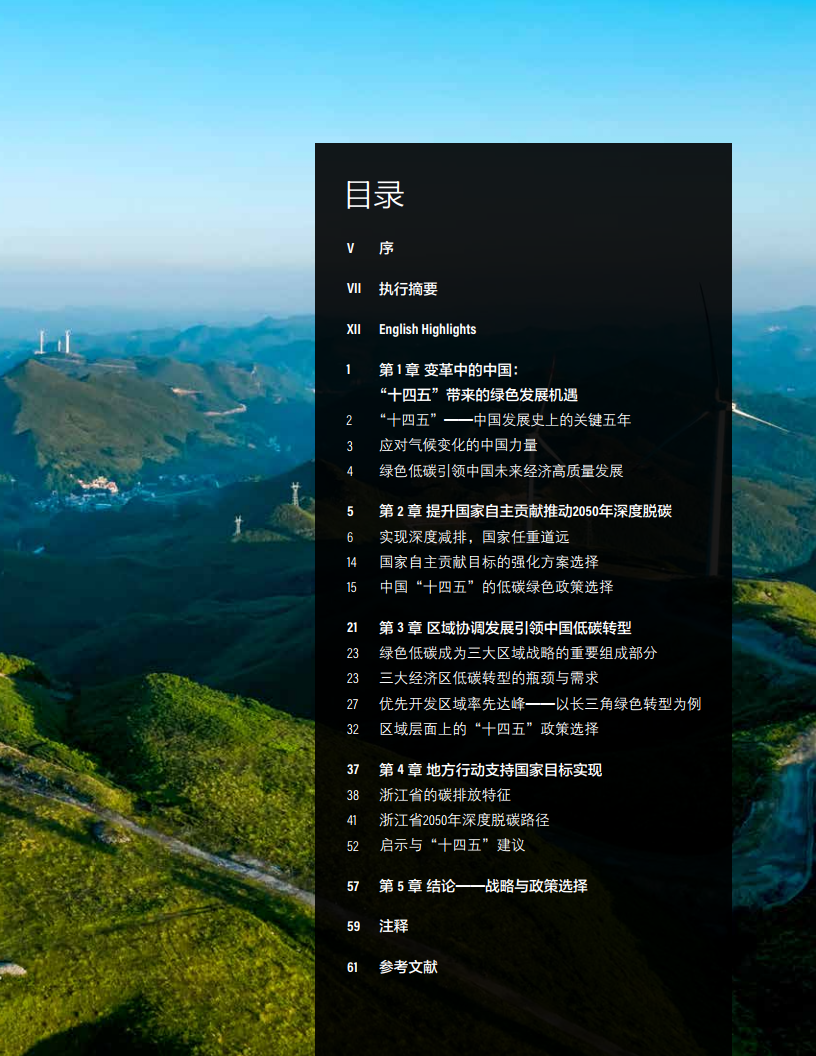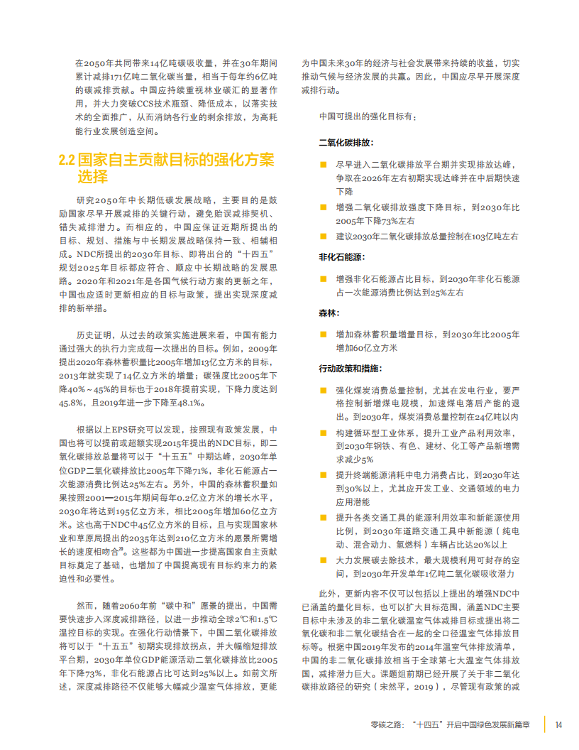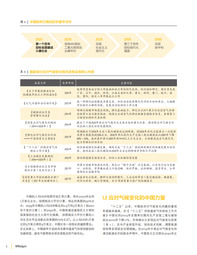 面对新冠肺炎疫情后种种不确定因素和最新的2030年前达峰及2060年前碳 中和的气候目标,中国必须在“十四五”(2021—2025年)初期提出一个更具 韧性、低碳、可持续的中长期经济发展计划,更新的国家自主贡献(Nationally Determined Contribution, 简称NDC)和长期温室气体低排放发展战略(Longterm low greenhouse gas emission development strategy,简称LTS),布局中长期 低碳发展蓝图,为中国生态文明建设、全球应对气候变化目标做出贡献。在此背景 下,世界资源研究所协同有关研究机构描绘了一幅中国在2050年实现深度脱碳的 愿景,并着重讨论正在筹划的国民经济和社会发展第十四个五年规划纲要(以下简 称“十四五”规划)中的低碳转型政策选择以及正在更新的国家自主贡献,希望该 报告能够为国家及地方政府决策提供科学参考与智力支持。