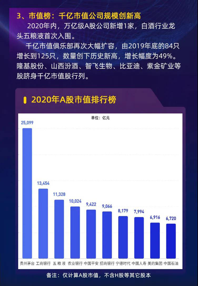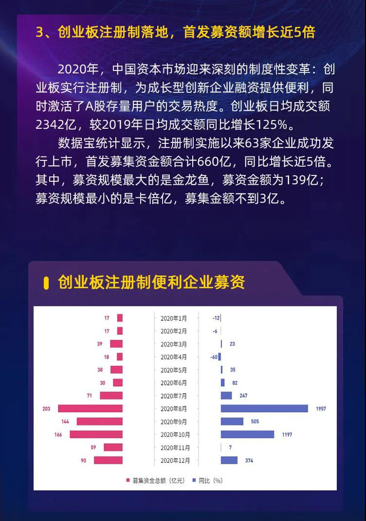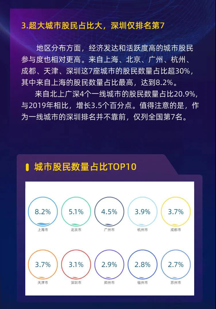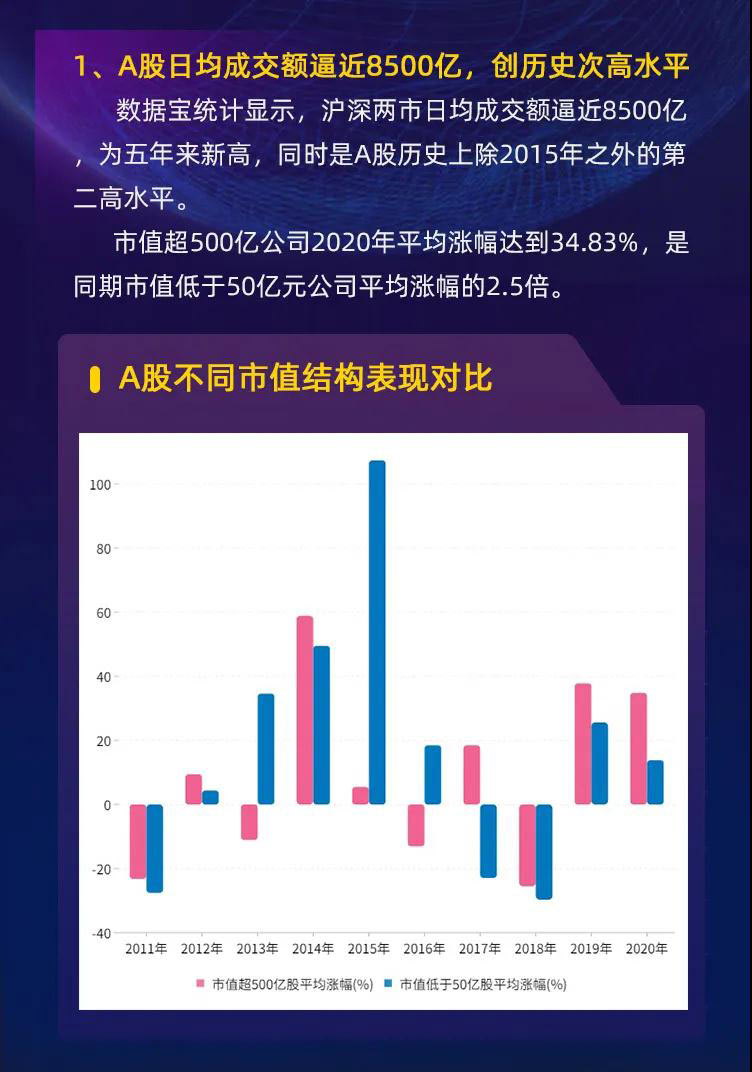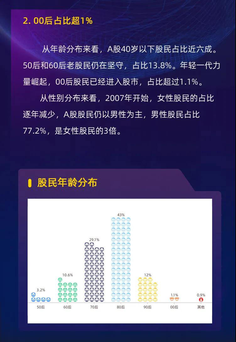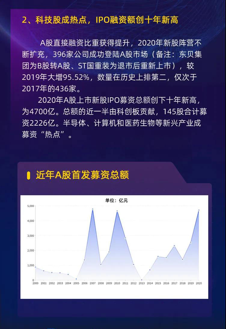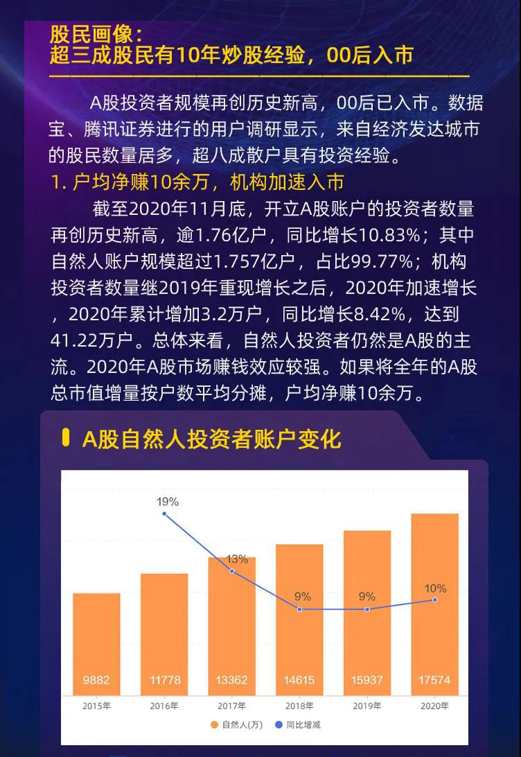 2020年A股画像:00后出道占股民1.1% 2020年,新冠疫情一度打破社会经济生活的常态,给资本市场带来独一无二的冲击。股市却逆势而上,在注册制改革的推动下,A股IPO募资金额创近十年新高,科技股发力,大消费股、顺周期股大放异彩,北上资金、外资纷纷涌入A股市场,对中国经济投了赞成票。 《A股画像(2020)》,从市场、人物、年度排行榜、上市公司等全方位出发,大数据全面透视值得纪念的2020年,为进击2021年做好铺垫。 (文章来源:数据宝 更多阅读:ChinaVenture:2015年7月A股定向增发市场 52家完成1529.26亿元美国追踪A股ETF本月已跌14%德勤:2014-2015中国A股上市公司高管薪酬调研报告Crunchbase:过去十年美国大型基金融资分析EnergyPolicyTracker:G20国家承诺投资5768.2亿美元支持能源发展Crunchbase:2018年中国初创企业已经获得938亿美元投资Lexington Law:美国的千禧一代对股市并不“感冒”CTR:中小城市青年观众电视收视特征简析世界经济论坛:2024年全球散户投资者报告德勤:2023年CEO调查南华早报:2021 年中国互联网报告研究报告青年人群和下沉人群是互联网理财“明日之星”preqin:女性仅占冲基金就业岗位的1/5Gallup:只有14%的女性使用理财网站咨询投资和退休建议Asymco每日一数:截止2014年6月底iOS系统设备已经销售886,580,000