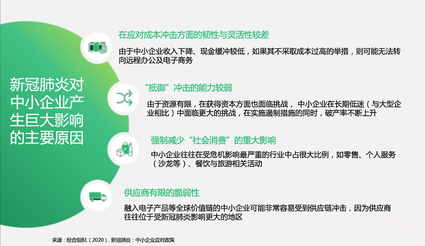 后疫情时期,这些企业面临着需要克服的巨大挑战。由于获得资本与现金储备的渠道较少,中小企业可能会发现其难以“抵御”疫情的长期影响。在疫情期间,这些企业启动的业务应急计划不够健全。一旦合作伙伴受到影响,那么供应商较少、较为单一的中小企业将面临更高的风险。在需求方面,中小企业往往在受疫情影响最严重的行业开展业务,如零售、个人服务以及旅游业。
