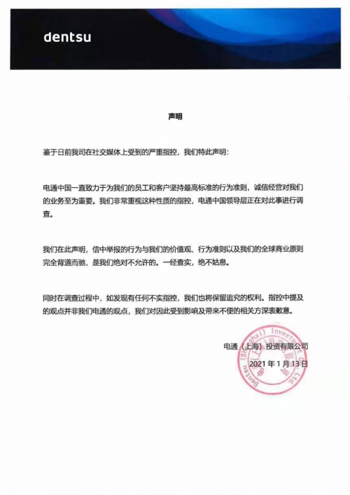 电通集团1月13日在官方社交媒体发布的一份声明显示,举报信中显示的一些行为与电通的价值观、行为准则以及全球商业原则“完全背道而驰”,目前正在对上述举报事件进行调查。