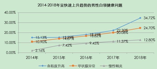 根据上海外服健康管理中心的数据,2018年男性白领体检检出率排名前五的异常情况分别为:体重超重(55.9%)、脂肪肝或脂肪肝浸润(53.4%)、血粘度升高(34.72%)、甘油三酯血症(30.7%)和血尿酸偏高(28.12%)。以上五项异常情况均与不健康的饮食及生活习惯有关,会增加男性白领患心脑血管疾病的风险。2014年到2018年,男性白领增长最快的体检异常情况依次为:慢性咽炎、甲状腺异常和血粘度升高,检出率在五年间均增长了1倍以上。其中,慢性咽炎的检出率更是从2014年的2.16%快速上升到了2018年的12.8.%,增长了近五倍。