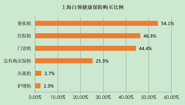 根据报告,目前大多数企业都为员工提供了健康体检福利,但除此之外的健康管理服务还较为欠缺,49.4%的受访白领表示需要疾病复查服务,47.5%则表示需要健康讲座类服务。同时,上海白领群体购买健康保险的意识也在不断加强。受访者中购买健康保险的比例已达到了74.7%,比上年增长了2.9个百分点。其中,购买重疾险的占比达54.1%,排名第一;排名二三位的依次为住院险(46.3%)和门诊险(44.4%)。社会和大众共同保障的力量越来越受重视,通过商业保险来抵御健康财务风险已成为主流趋势。