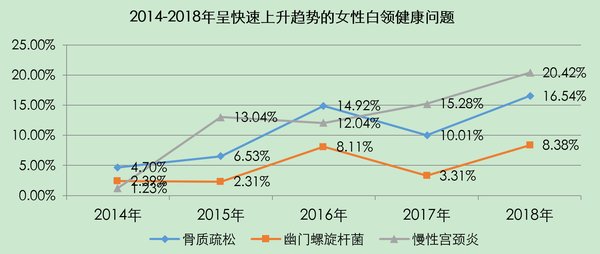 2018年女性白领体检检出率排名前五的异常情况分别为:双乳小叶增生(86.4%)、外痔(28.0%)、体重超重(21.1%)、慢性宫颈炎(20.4%)和骨质疏松(16.5%),其中三项异常都与女性特有的生理特点相关。2014年到2018年,女性白领增长最快的体检异常情况依次为:慢性宫颈炎、骨质疏松和幽门螺杆菌阳性,检出率在五年间均增长了两倍以上。尤其是慢性宫颈炎,检出率从2014年的1.2%迅速上增长到了2018年的20.4%,增加了近16倍。