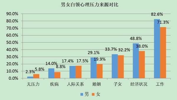 根据调研,九成以上的被访白领表示正在承受来自各方面的压力。其中,75.1%的白领表示压力来源于工作,其后依次为经济状况(41.6%)、子女(32.7%)、婚姻(23%),人际关系(17.5%)和疾病10.5%。其中,男性白领的压力明显高于女性白领,特别在工作、经济状况和婚姻的压力上,男性均比女性高出约10个百分点。