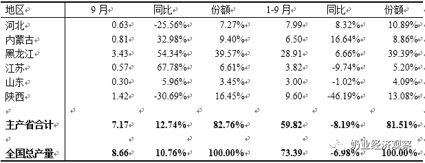 1-9月,奶粉产量前6省份中,同比正负增长的省份各3个,6省合计59.82万吨,同比下降8.19%,占全国总产量81.51%,黑龙江产量第一,28.91万吨,同比增长6.66%,占总产量的39.39%。这6个省份9月份产量合计7.17万吨,同比增长12.74%,占9月总产量的82.76%。