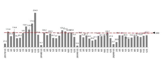2020年12月购买指数为89.6,消费者实际购买意愿提升