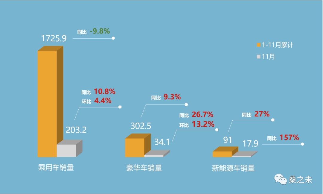 1-11月,乘用车累计销售1726万辆,同比下滑9.8%,较去年减少188万辆;新能源车累计销售91万辆,同比增长27%;豪华车累计销售303万辆,同比增长9.3%,较去年增长25.7万辆。