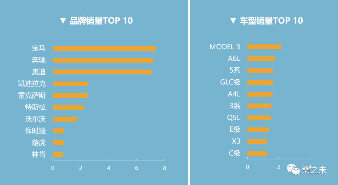 11月,Model 3以2.2万辆首次超过众多豪华品牌车型,销量居首;奥迪A6L以1.76万辆销量居次;宝马3系、5系、奔驰GLC销量均超过1.6万辆;奥迪A4L、奥迪Q5L销量均超过1.5万辆。