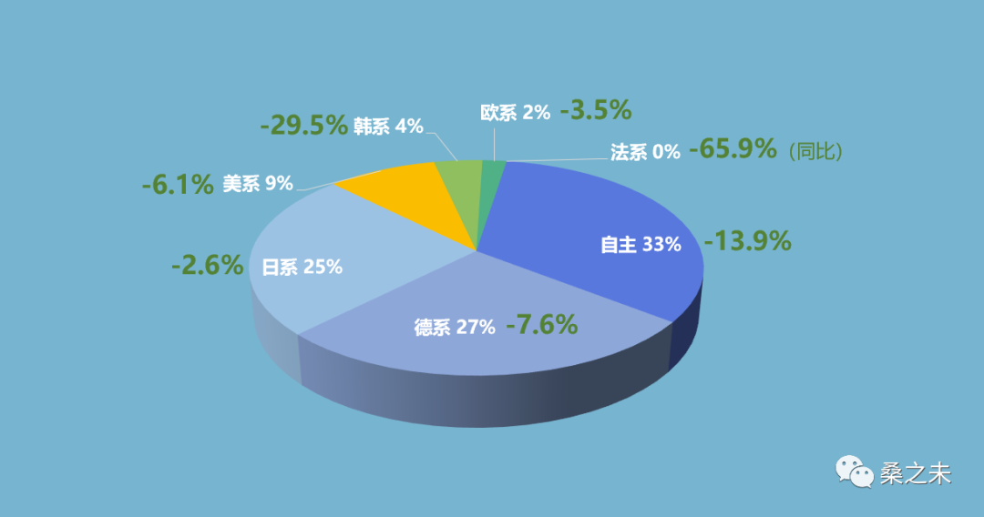 1-11月,乘用车经销商零售累计销售1726万辆新车,同比下滑9.8%,比去年减少188万辆;自主品牌市占率为33%,比去年同期下降1个百分点,德系品牌27%与去年持平,日系品牌25%比去年同期上涨2个百分点,美系品牌9%与去年持平,韩系品牌4%比去年同期下降1个百分点,法系品牌市占率由去年1个百分点跌为零,以沃尔沃、捷豹路虎等品牌为代表的欧系品牌市占率上涨1个百分点至2个百分点。