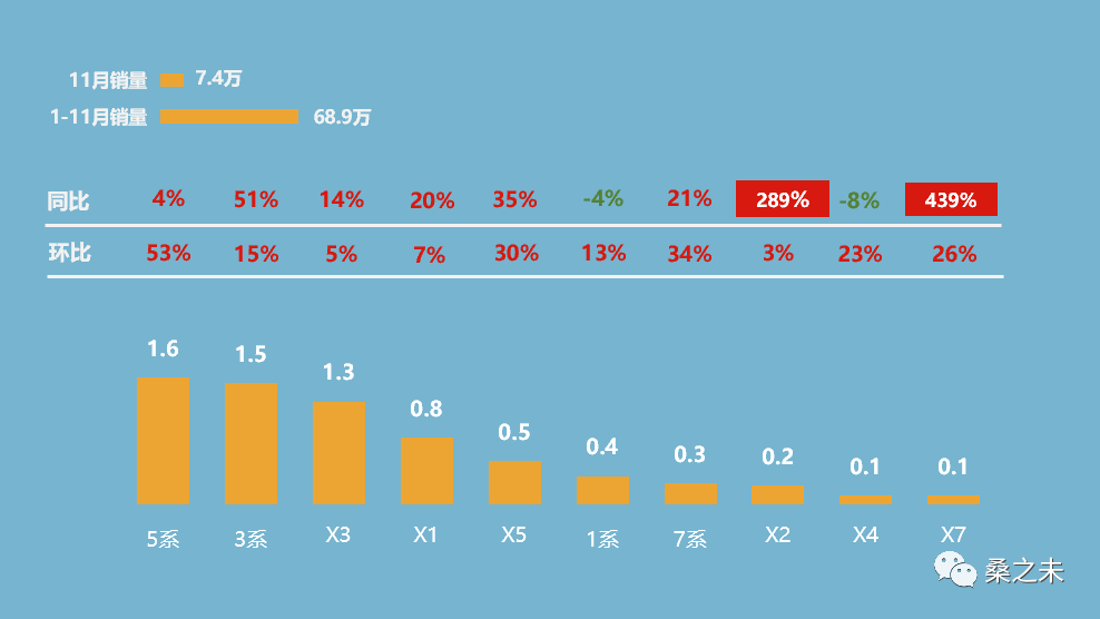 11月份宝马的销售质量得到进一步提升,经销商零售利润改善显著,部分经销商新车利润能到5个多百分点;11月是中期改款后的宝马5系第二个完整销售月,共销售1.2万辆,环比增长53%,成交均价为44.2万元;如果加上插电版本车型和进口5系,销量已经超过1.6万辆,新车折扣在8个百分点左右,改款前5系折扣在12个百分点左右,5系因销售收入占比较大,折扣的回升对经销商新车利润帮助较大;宝马3系优势地位进一步巩固,11月份销售1.5万辆,环比增长15%,销售折扣控制在10%左右;另外一款销售过万的车型是X3,11月份销售1.3万辆,环比增长5%;进口车型X5销售5500辆,环比增长30%,X7销售1100辆,环比增长26%。