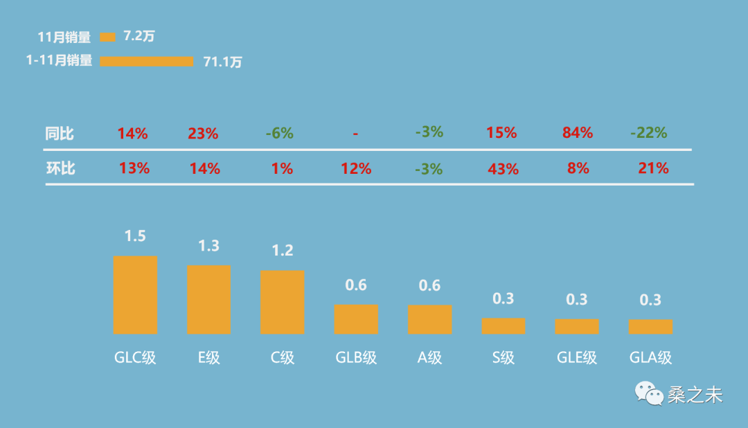 11月,奔驰销量最多的车型是GLC,销售1.5万辆,同比增长14%;9月末中期改款的E级车在11月份销售1.3万辆,同比增长23%,环比增长14%,成交均价为49.9万元,折扣水平在6个百分点左右,改款后的E级车得到消费者认同,新车销售有较好的利润。11月,奔驰GLB销售5680辆,GLA销售2830辆,A级车销售5590辆,这三款紧凑级车型销量较为稳定,对调整国产车型的销售结构有较大的帮助。进口车车型中,奔驰S级销量突破3000辆,同比增长15%,GLE销量增长41%,增长84%。