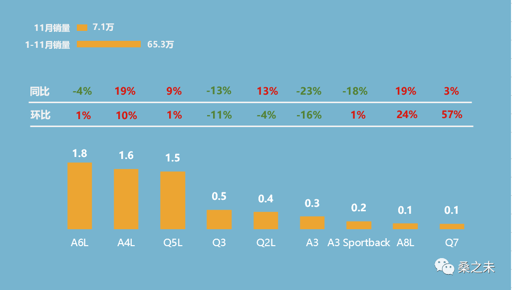 11月,奥迪A4L销售1.6万辆,同比增长19%,A6L销售1.6万辆,A6L e-tron销售1020辆,Q5L销售1.5万辆,同比增长9%。在紧凑级市场,奥迪紧凑型组合中Q3销售5100辆,Q2L销售4500辆,A3两款车型销售5400辆,奥迪紧凑型与小型车销量稳定在1.5万辆左右,这样奥迪每个月销量基本在6万辆左右,奥迪需要进一步提升进口车型销量,用来提升经销商销售利润。