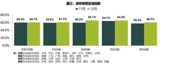 从区域指数情况看:12月份全国总指数为60.7%,北区指数为61.6%,东区指数为66.1%,西区指数为65.9%,南区指数为60.7%。部分地区疫情反复,使当地经销商客流量和销售受到一定影响。