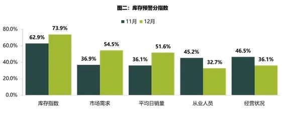 从分指数情况看:12月份库存指数明显上升,环比提升11个百分点,反映出经销商库存压力加大。同时市场需求指数、平均日销量指数环比上升,说明市场消费需求和终端成交环比提升。但从业人员指数、经营状况指数环比下降,经销商的经营压力进一步提升。