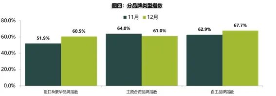 从分品牌类型指数看:12月份进口&豪华品牌指数、自主品牌指数环比上升,主流合资品牌环比下降。