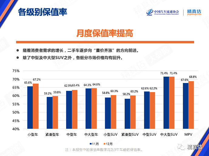 2021年1月4日,中国汽车流通协会和精真估联合发布了《2020年12月中国汽车保值率研究报告》。通过保值率研究旨在反应该品牌的产品力、认知度、美誉度等综合实力,对未来开展回购、置换、租赁、金融、新车定价参考等相关业务提供重要数据参考,从而降低业务风险,提升经营效率。