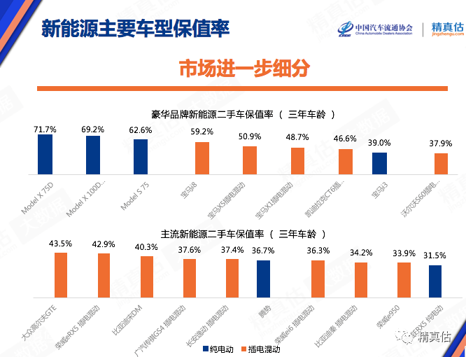 特斯拉和宝马代表的豪华品牌新能源车,保值率相比其他主流品牌有很大的优势。非豪华品牌当中,高尔夫的保值率高于自主品牌相同车龄的车型。其中插电混动车型比纯电动车型更保值。当把市场进一步细分之后,发现纯电动二手车的价格出现两个极端,特斯拉较高但是吉利等自主品牌保值率低。
