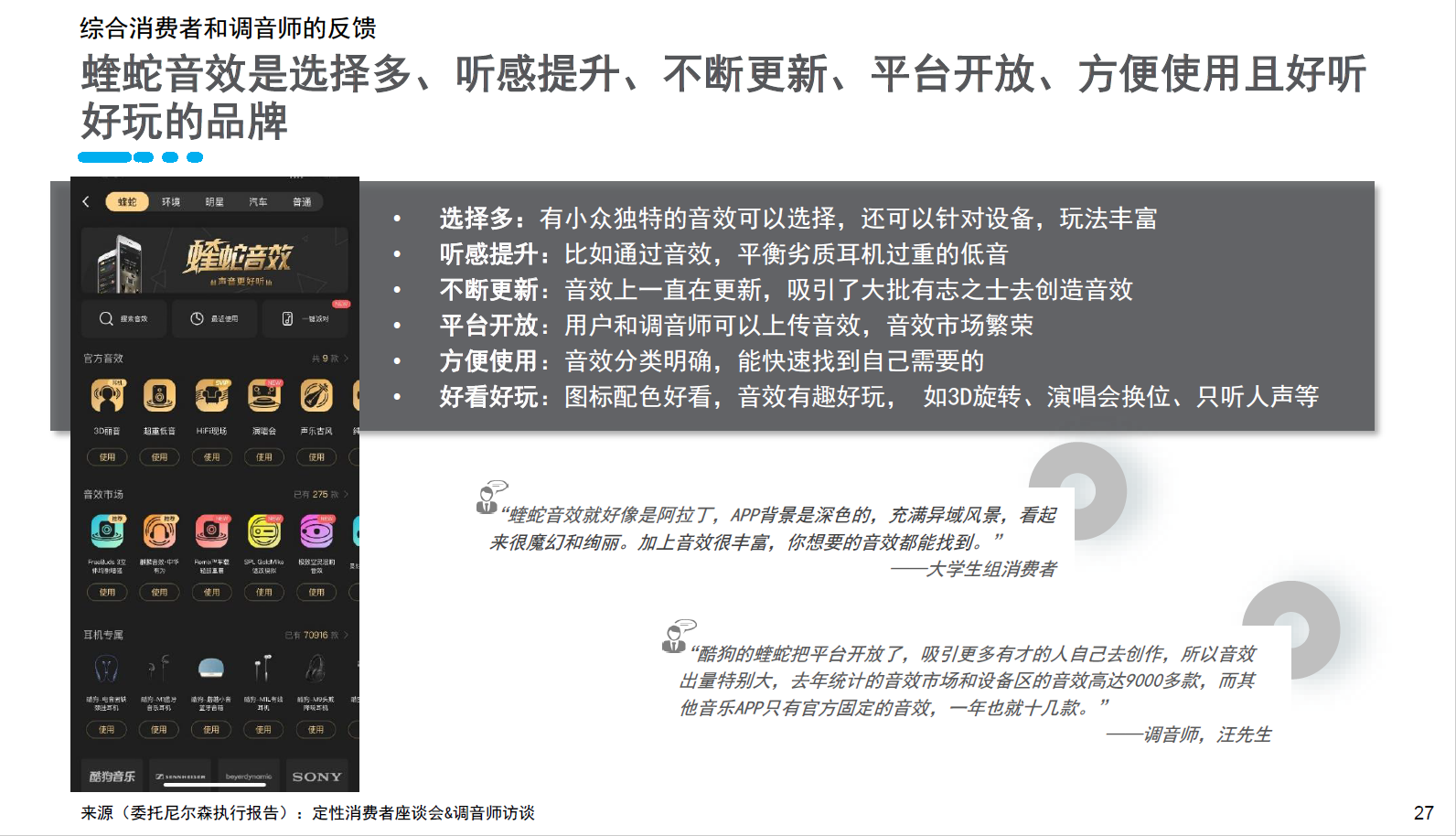 通过大量的调研反馈,蝰蛇音效在C端市场拥有良好的口碑。在品牌体验上,蝰蛇音效是体验较多的移动端音效品牌;也是消费者喜欢、推荐的品牌,消费者认为蝰蛇音效具有场景多、音效多、有趣玩法多、满足个性需求、更能适配国内音乐等突出优势。